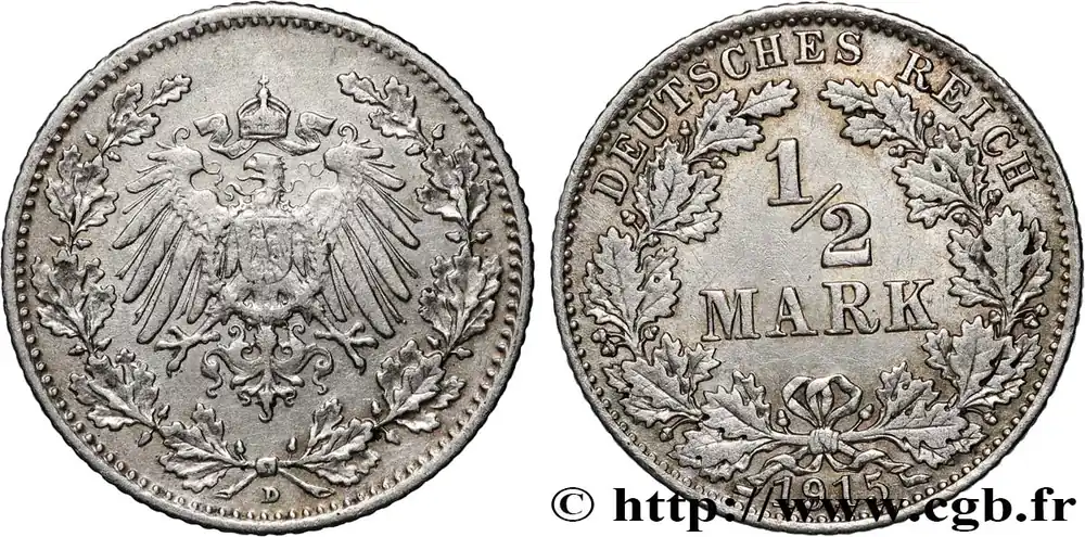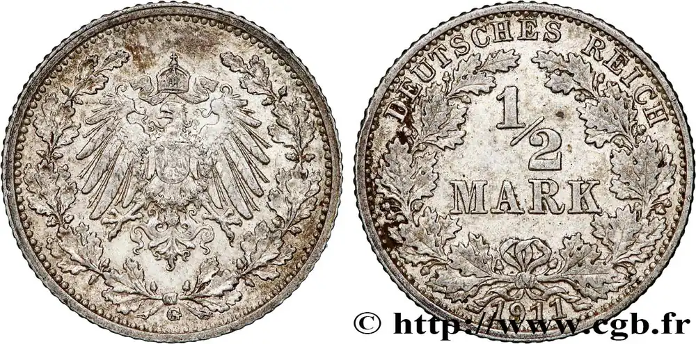 Type : 1/2 Mark Empire aigle impérialDate : 1906Nom de l’atelier/ville : BerlinQuantité frappée : 29753852Métal : argentTitre en millième : 900 ‰Diamètre : 20 mmAxe des coins : 12 h.Poids : 2,77 g.Tranche : canneléeCommentaires sur l’état de conservation :Monnaie nettoyéeRéférence ouvrage :AKS.6  – KM20/17 AversTitulature avers : (LETTRE D’ATELIER).Description avers : aigle héraldique couronné entre deux rameaux de chêne.ReversTitulature revers : DEUTSCHES REICH / 1/2 / MARK / (DATE).Description revers : dans le champ entre deux rameaux de chêne.HistoriqueALLEMAGNE