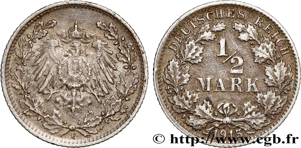 Type : 1/2 Mark Empire aigle impérialDate : 1906Nom de l’atelier/ville : Stuttgart – FQuantité frappée : 8535644Métal : argentTitre en millième : 900 ‰Diamètre : 20 mmAxe des coins : 12 h.Poids : 2,77 g.Tranche : canneléeRéférence ouvrage :AKS.6 – KM20/17 AversTitulature avers : (LETTRE D’ATELIER).Description avers : aigle héraldique couronné entre deux rameaux de chêne.ReversTitulature revers : DEUTSCHES REICH / 1/2 / MARK / (DATE).Description revers : dans le champ entre deux rameaux de chêne.HistoriqueALLEMAGNE