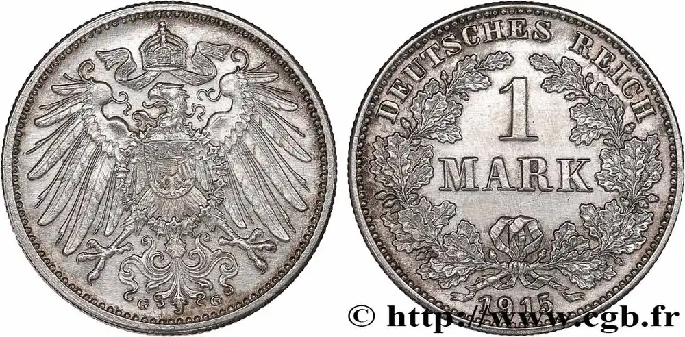 Type : 1 Mark Empire aigle impérialDate : 1875Nom de l’atelier/ville : Hambourg – JQuantité frappée : 2727701Métal : argentTitre en millième : 900 ‰Diamètre : 24 mmAxe des coins : 12 h.Poids : 5,27 g.Tranche : canneléeRéférence ouvrage :AKS.1 – KM.19/7 AversTitulature avers : (LETTRE D’ATELIER).Description avers : aigle impériale.ReversTitulature revers : DEUTSCHES REICH // 1 / MARK // (DATE).Description revers : dans le champ, entre deux rameaux de chêne.HistoriqueALLEMAGNE