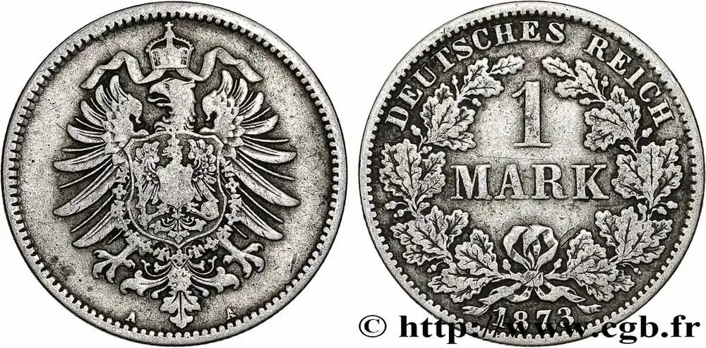 Type : 1 Mark Empire aigle impérialDate : 1878Nom de l’atelier/ville : Stuttgart – FQuantité frappée : 1038901Métal : argentTitre en millième : 900 ‰Diamètre : 24 mmAxe des coins : 12 h.Poids : 5,35 g.Tranche : canneléeRéférence ouvrage :AKS.1 – KM.19/7 AversTitulature avers : (LETTRE D’ATELIER).Description avers : aigle impériale.ReversTitulature revers : DEUTSCHES REICH // 1 / MARK // (DATE).Description revers : dans le champ, entre deux rameaux de chêne.HistoriqueALLEMAGNE