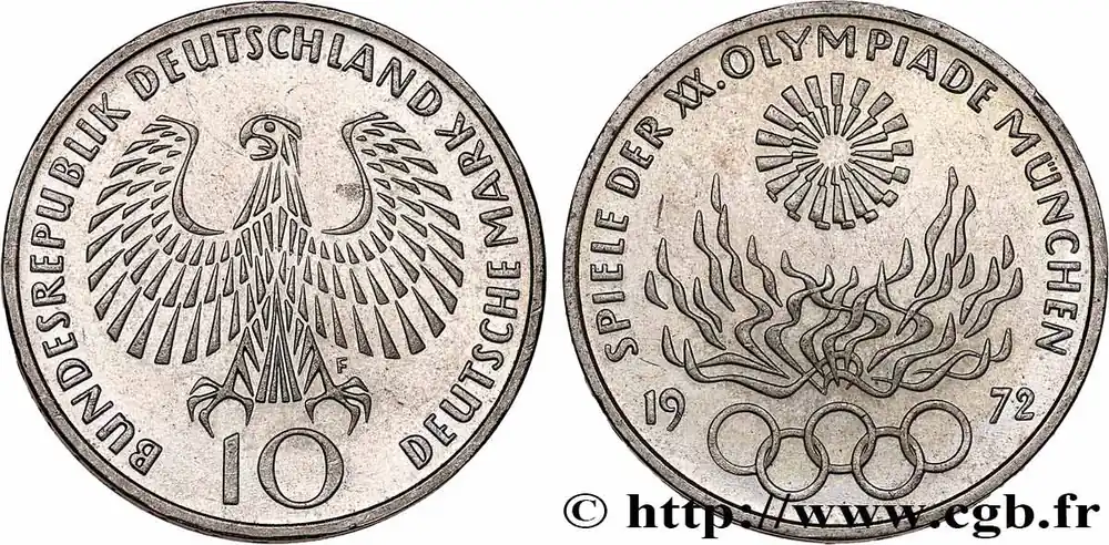 Type : 10 Mark / XXe J.O. Munich – Flamme olympiqueDate : 1972Nom de l’atelier/ville : HambourgQuantité frappée : 4850000Métal : argentTitre en millième : 625 ‰Diamètre : 33 mmAxe des coins : 12 h.Poids : 15,46 g.Tranche : inscrite en creux CITIUS ALTIUS FORTIUSRéférence ouvrage :AKS.205  – KM20/135 AversTitulature avers : BUNDESREPUBLIK DEUTSCHLAND 10 DEUTSCHE MARK J.Description avers : Aigle aux ailes déployées.ReversTitulature revers : SPIELE DER XX. OLYMPIADE MUNCHEN / 1972.Description revers : Symbole olympiques sous une flamme, le tout surmonté d’un astre.HistoriqueALLEMAGNE