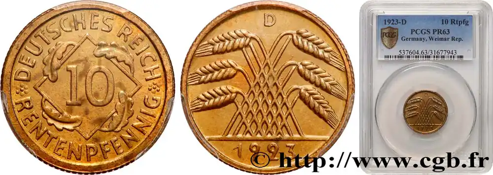 Type : 10 Rentenpfennig gerbe de bléDate : 1924Nom de l’atelier/ville : BerlinQuantité frappée : 169956017Métal : bronze-aluminiumDiamètre : 21 mmAxe des coins : 12 h.Poids : 4 g.Tranche : canneléeRéférence ouvrage :AKS.44  – KM20/33 AversTitulature avers : *DEUTSCHES REICH // RENTENPFENNIG.Description avers : chiffre 10 dans un losange entouré de quatre feuilles de chêne.ReversTitulature revers : A // 1924.Description revers : épis de blé croisés.HistoriqueALLEMAGNE