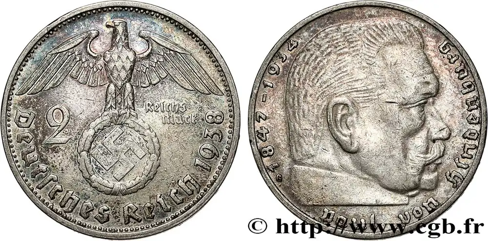 Type : 2 Reichsmark Maréchal Paul von HindenburgDate : 1937Nom de l’atelier/ville : BerlinQuantité frappée : 23425000Métal : argentTitre en millième : 625 ‰Diamètre : 25 mmAxe des coins : 12 h.Poids : 8 g.Tranche : inscrite en creux Gemeinnutz geht vor EigennutzCommentaires sur l’état de conservation :légères rayures au reversRéférence ouvrage :AKS.33 – KM20/93 AversTitulature avers : DEUTSCHES REICH 1937.Description avers : Aigle héraldique surmontant une svastika, inscription 2 – Reichsmark.ReversTitulature revers : PAUL VON HINDENBURG /1847-1934.Description revers : Portrait à droite du maréchal Paul von Hindenburg.CommentaireIMPORTANT : Cette monnaie est un objet de collection, témoin de l’histoire, il n’est en aucun cas l’expression d’une quelconque apologie du nazisme. Toute utilisation de cette monnaie en dehors du champ strict de la collection numismatique est interdite. L’acheteur s’engage à ne pas faire l’apologie du nazisme et la société de vente ne pourra être tenue responsable d’une toute autre utilisation par l’acheteur de la monnaie.HistoriqueALLEMAGNE