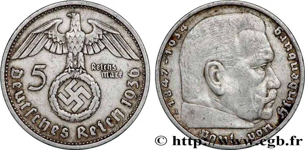 Type : 5 Reichsmark Maréchal Paul von HindenburgDate : 1936Nom de l’atelier/ville : MunichQuantité frappée : 7032000Métal : argentTitre en millième : 900 ‰Diamètre : 29 mmAxe des coins : 12 h.Poids : 13,90 g.Tranche : incrite en creux Gemeinnutz geht vor EigennutzCommentaires sur l’état de conservation :Monnaie nettoyéeRéférence ouvrage :AKS.27 – KM20/86 AversTitulature avers : DEUTSCHES REICH 1936.Description avers : aigle héraldique.ReversTitulature revers : PAUL VON HINDENBURG / 1847-1934.Description revers : portrait à droite du maréchal Paul von Hindenburg.HistoriqueALLEMAGNE