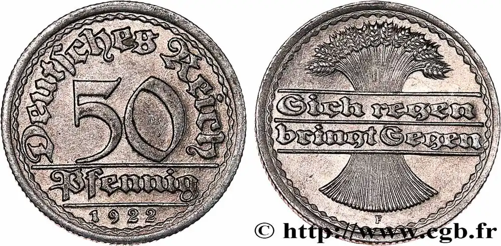 Type : 50 PfennigDate : 1876Nom de l’atelier/ville : MuldenhuttenQuantité frappée : 4127389Métal : argentTitre en millième : 900 ‰Diamètre : 20 mmAxe des coins : 12 h.Poids : 2,70 g.Tranche : canneléeRéférence ouvrage :AKS.3 – KM.19/6 AversTitulature avers : E – E.Description avers : aigle impériale entre deux rameaux de chêne.ReversTitulature revers : DEUTSCHER REICH 1876 // 50 / PFENNIG.Description revers : dans le champ entre deux rameaux de chêne.HistoriqueALLEMAGNE