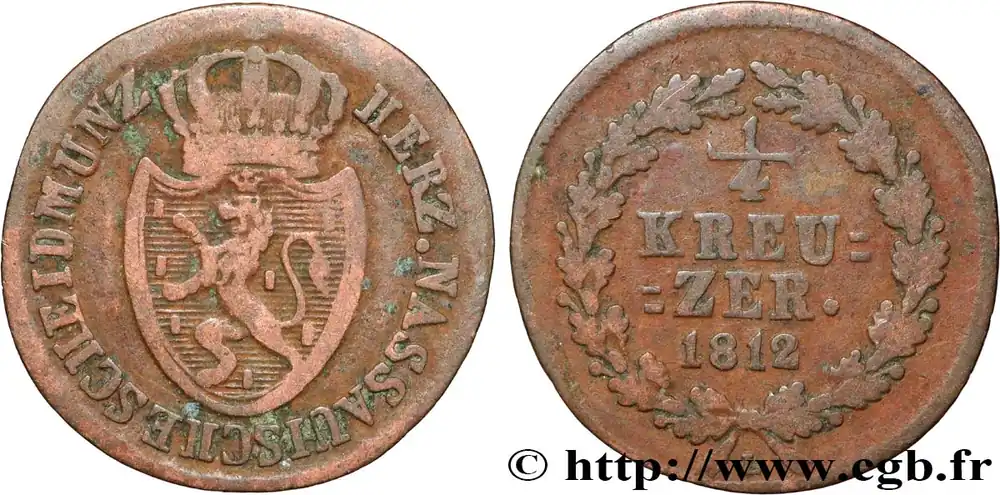 Type : 1/4 Kreuzer Grand-Duché de NassauDate : 1817Quantité frappée : 433000Métal : cuivreDiamètre : 19 mmAxe des coins : 12 h.Poids : 1,31 g.Tranche : lisseRéférence ouvrage :AKS.55 – KM19/41 AversTitulature avers : HERZ• NASSAUISCHE SCHEID MÜNZ.Description avers : armes couronnée du Grand-Duché de Nassau.ReversTitulature revers : 1/4 / KREU= / =ZER. / 1817.Description revers : au centre d’une couronne formée de rameaux de chêne.CommentairePour ce type et cette année, il existe des variétés de légendes d’avers et de revers.HistoriqueALLEMAGNE – NASSAU