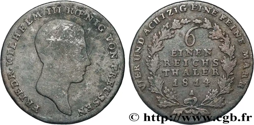 Type : 1/6 Thaler Frédéric-Guillaume IIIDate : 1827Nom de l’atelier/ville : DüsseldorfQuantité frappée : 924000Métal : argentTitre en millième : 521 ‰Diamètre : 23 mmAxe des coins : 12 h.Poids : 4,92 g.Tranche : décorée en creuxCommentaires sur l’état de conservation :Monnaie nettoyé, des aspérités de surface à l’aversRéférence ouvrage :KM.19/411 – AKS.26 AversTitulature avers : FRIEDR. WILH. III KOENIG V.PREUSSEN // D.Description avers : portrait à droite de Frédéric-Guillaume III roi de Prusse.Traduction avers : (Frédaric-Guillaume III roi de Prusse).ReversTitulature revers : VI. EINEN THALER LXXXIV EINE F.M. // 1827.Description revers : écu à l’aigle héraldique couronné.Traduction revers : (1/6e de thaler – 1/84e livre de fin).HistoriqueALLEMAGNE – PRUSSE