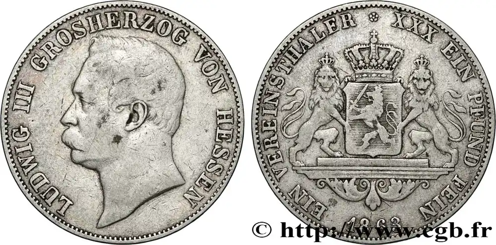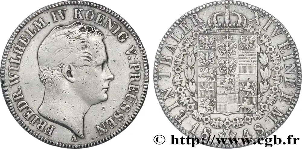 Type : 1 Thaler Date : 1865Nom de l’atelier/ville : BerlinQuantité frappée : 2583732Métal : argentTitre en millième : 900 ‰Diamètre : 33 mmAxe des coins : 12 h.Poids : 18,26 g.Tranche : incuseRéférence ouvrage :AKS.99 – KM20/494 AversTitulature avers : WILHELM KOENIG VON PREUSSEN.Description avers : Portrait à droite, dessous lettre A.Traduction avers : (Guillaume roi de Prusse).ReversTitulature revers : EIN VEREINSTHALER XXX EIN PFUND FEIN // 1865.Description revers : Aigle héraldique couronné.HistoriqueALLEMAGNE – ROYAUME DE PRUSSE – GUILLAUME Ier(2/01/1861-9/03/1888) Guillaume Ier est le second fils de Frédéric Guillaume III et le frère de Frédéric Guillaume IV. Il est régent pour son frère depuis 1856 quand il lui succède en 1861. Il épouse Augusta de Saxe-Weimar de qui il a deux enfants dont Frédéric III. Avec son ministre Otto von Bismarck, il va réaliser l’unité allemande. La guerre austro-prussienne de 1866 avec la victoire de Sadowa le débarrasse de l’Autriche et renforce la Confédération de l’Allemagne du Nord. La guerre entamée contre la France en 1870 va lui amener, par le traité de Francfort, l’Alsace et la Lorraine le 10 mai 1871. Le 28 janvier 1871, il est couronné empereur d’Allemagne dans la galerie des glaces du château de Versailles. Le paiement de l’indemnité de 5 milliards de francs-or versée par la France va lui permettre de réussir sa réforme monétaire, basée sur l’étalon or. Bismarck reste premier ministre de Prusse et impose ses vues en matière de politique étrangère : isolement de la France, alliance avec l’Italie, l’Autriche et la Russie. Le congrès de Berlin permet à l’Allemagne de se poser en arbitre de l’Europe et de se constituer un empire colonial en Afrique, Asie et Océanie. Guillaume Ier meurt nonagénaire en 1888.