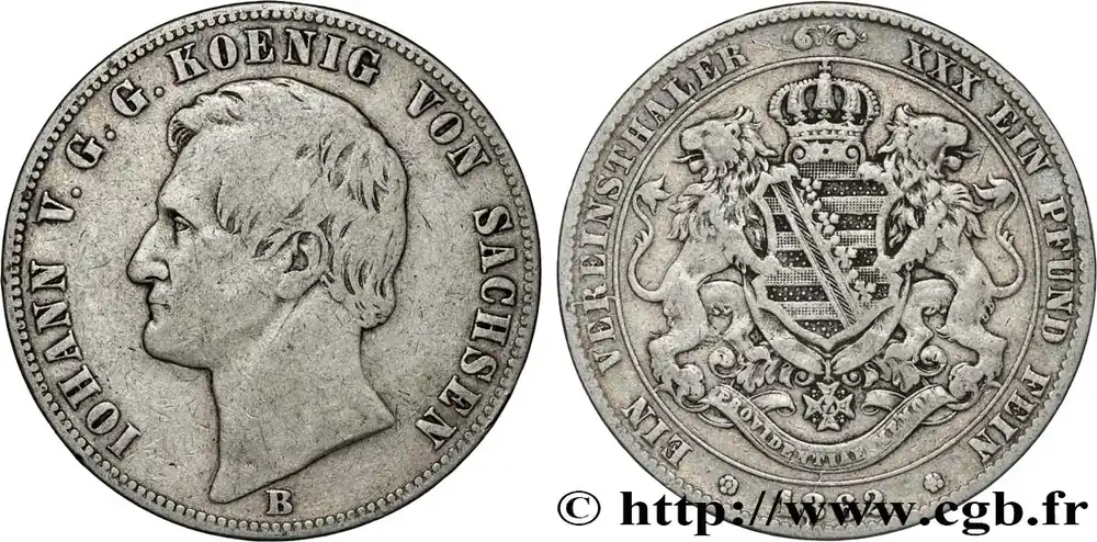 Type : 1 Thaler Date : 1865Nom de l’atelier/ville : BerlinQuantité frappée : 2583732Métal : argentTitre en millième : 900 ‰Diamètre : 33 mmAxe des coins : 12 h.Poids : 18,26 g.Tranche : incuseRéférence ouvrage :AKS.99  – KM20/494 AversTitulature avers : WILHELM KOENIG VON PREUSSEN.Description avers : Portrait à droite, dessous lettre A.Traduction avers : (Guillaume roi de Prusse).ReversTitulature revers : EIN VEREINSTHALER XXX EIN PFUND FEIN // 1865.Description revers : Aigle héraldique couronné.HistoriqueALLEMAGNE – ROYAUME DE PRUSSE – GUILLAUME Ier(2/01/1861-9/03/1888) Guillaume Ier est le second fils de Frédéric Guillaume III et le frère de Frédéric Guillaume IV. Il est régent pour son frère depuis 1856 quand il lui succède en 1861. Il épouse Augusta de Saxe-Weimar de qui il a deux enfants dont Frédéric III. Avec son ministre Otto von Bismarck, il va réaliser l’unité allemande. La guerre austro-prussienne de 1866 avec la victoire de Sadowa le débarrasse de l’Autriche et renforce la Confédération de l’Allemagne du Nord. La guerre entamée contre la France en 1870 va lui amener, par le traité de Francfort, l’Alsace et la Lorraine le 10 mai 1871. Le 28 janvier 1871, il est couronné empereur d’Allemagne dans la galerie des glaces du château de Versailles. Le paiement de l’indemnité de 5 milliards de francs-or versée par la France va lui permettre de réussir sa réforme monétaire, basée sur l’étalon or. Bismarck reste premier ministre de Prusse et impose ses vues en matière de politique étrangère : isolement de la France, alliance avec l’Italie, l’Autriche et la Russie. Le congrès de Berlin permet à l’Allemagne de se poser en arbitre de l’Europe et de se constituer un empire colonial en Afrique, Asie et Océanie. Guillaume Ier meurt nonagénaire en 1888.