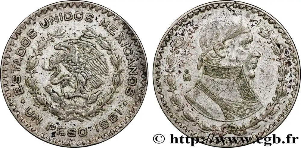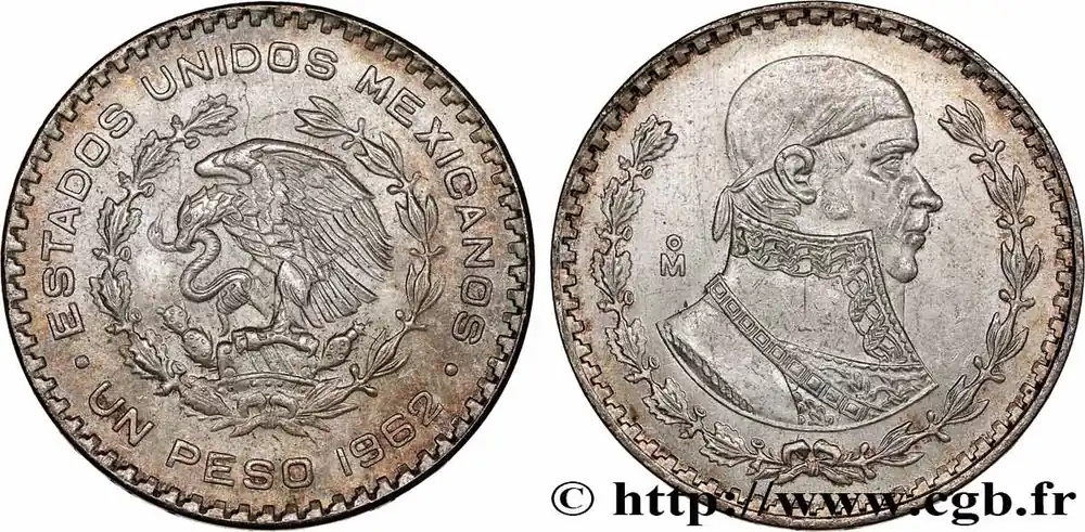 Type : 1 Peso Jose Morelos y PavonDate : 1962Nom de l’atelier/ville : MexicoQuantité frappée : 61094000Métal : argentTitre en millième : 10 ‰Diamètre : 33 mmAxe des coins : 6 h.Poids : 15,94 g.Tranche : incuseCommentaires sur l’état de conservation :rayures au reversRéférence ouvrage :KM20/459 AversTitulature avers : ESTADOS UNIDOS MEXICANOS / . UN PESO (DATE) ..Description avers : aigle perché sur un figuier de Barbarie dévorant un serpent.Traduction avers : (États-Unis du Mexique).ReversDescription revers : portrait à droite de Jose Morelos y Pavon dans une couronne de chêne et d’olivier.HistoriqueMEXIQUE