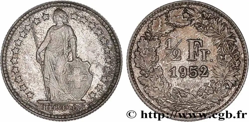 Type : 1/2 Franc HelvetiaDate : 1960Nom de l’atelier/ville : BerneQuantité frappée : 14528000Métal : argentTitre en millième : 835 ‰Diamètre : 18,10 mmAxe des coins : 6 h.Poids : 2,5 g.Tranche : canneléeRéférence ouvrage :KM20/23 AversTitulature avers : HELVETIA.Description avers : Helvetia debout tenant une lance et un bouclier à la croix posé à ses pieds, dans une couronne d’étoile.ReversTitulature revers : 1/2 FR. ET (DATE).Description revers : dans une couronne composite, de feuilles de chênes à gauche et de fleurs variées à droite.HistoriqueSUISSE