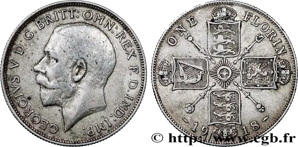 Type : 1 Florin Georges VDate : 1918Nom de l’atelier/ville : Melbourne – MQuantité frappée : 2095000Métal : argentTitre en millième : 925 ‰Diamètre : 28 mmAxe des coins : 12 h.Poids : 11,24 g.Tranche : canneléeRéférence ouvrage :KM20/27 AversTitulature avers : GEORGIUS V D.G.BR:OMN:REX F.D.IND:IMP:.Description avers : Buste couronné à gauche du roi Georges V.ReversTitulature revers : ONE FLORIN – TWO SHILLINGS // 1918 / M.Description revers : Émeu et kangourou de part et d’autre d’un écu, motto ADVANCE AUSTRALIA.HistoriqueAUSTRALIE
