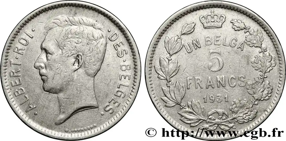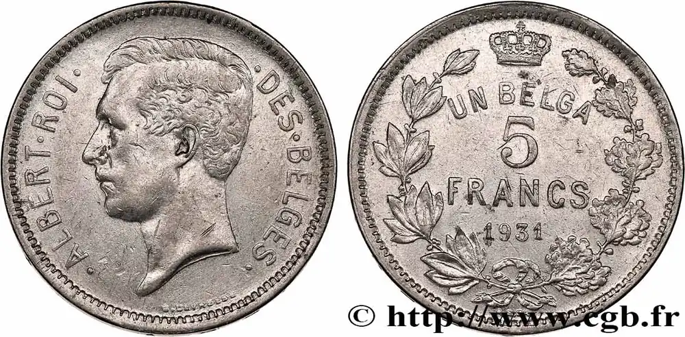 Type : 5 Francs – 1 Belga Albert Ier légende FrançaiseDate : 1930Quantité frappée : 1600000Métal : nickelDiamètre : 31 mmAxe des coins : 6 h.Poids : 13,92 g.Tranche : inscrite en creux * * BELGIQUE * * BELGIECommentaires sur l’état de conservation :Monnaie nettoyéeRéférence ouvrage :KM20/97.1 AversTitulature avers : ·ALBERT·ROI· ·DES·BELGES· // G. DEVREESE.Description avers : portrait à gauche du roi Albert Ier.ReversTitulature revers : UN BELGA / 5 / FRANCS / 1931 // A.E.GR.Description revers : armes du Royaume de Belgique.CommentaireTranche position A : quand la monnaie est posée portrait en dessous, la légende de la tranche est à l’endroit.HistoriqueBELGIQUE
