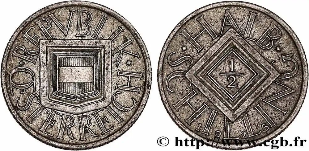 Type : 1/2 SchillingDate : 1925Quantité frappée : 18370000Métal : argentTitre en millième : 640 ‰Diamètre : 19 mmAxe des coins : 12 h.Poids : 2,94 g.Tranche : canneléeRéférence ouvrage :KM20/2839 AversTitulature avers : ·REPVBLIK· // ŒSTERREICH.Description avers : écu autrichien.ReversTitulature revers : ·HALB· // 1/2 // SCHILLING / 1925.Description revers : dans le champ losange.HistoriqueAUTRICHE