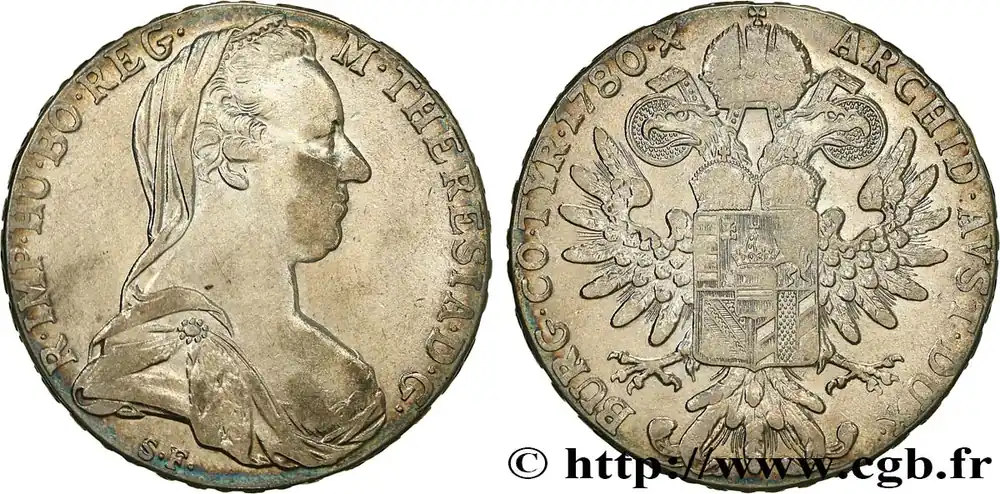 Type : 1 Thaler (REFRAPPE) Marie-ThérèseDate : 1780Nom de l’atelier/ville : VienneQuantité frappée : 390000000 (estimation)Métal : argentTitre en millième : 833 ‰Diamètre : 41 mmAxe des coins : 12 h.Poids : 28,07 g.Tranche : en reliefRéférence ouvrage :KM/WC.18/1924.2 AversTitulature avers : M. THERESIA D. G. R. IMP. HU. BO. REG..Description avers : portrait à droite de Marie-Thérèse d’Autriche.ReversTitulature revers : ARCHID. AVST. DUX BURG. CO. TYR. 1780 X.Description revers : écu sur aigle bicéphale couronné.CommentaireDepuis 1780, le thaler de Marie-Thérèse porte toujours l’année 1780. Il a été frappée par les ateliers de Birmingham, Bombay, Bruxelles, Londres, Paris, Rome et Utrecht, et bien sûr par les ateliers autrichiens de Hall, Günzburg, Kremnica, Karlsburg, Milan, Prague et Vienne.HistoriqueAUTRICHE