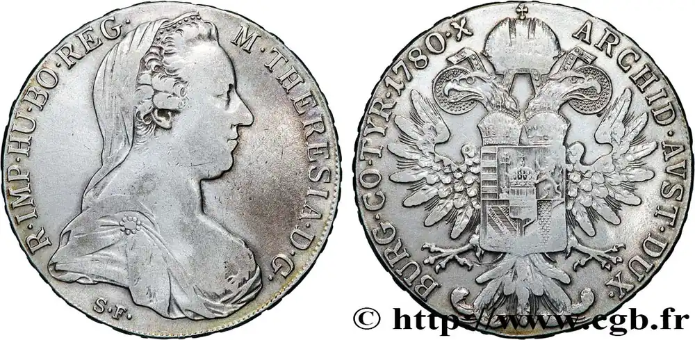 Type : 1 Thaler (REFRAPPE) Marie-ThérèseDate : 1780Nom de l’atelier/ville : VienneQuantité frappée : 390000000 (estimation)Métal : argentTitre en millième : 833 ‰Diamètre : 41 mmAxe des coins : 12 h.Poids : 28,07 g.Tranche : en reliefRéférence ouvrage :KM/WC.18/1924.2 AversTitulature avers : M. THERESIA D. G. R. IMP. HU. BO. REG..Description avers : portrait à droite de Marie-Thérèse d’Autriche.ReversTitulature revers : ARCHID. AVST. DUX BURG. CO. TYR. 1780 X.Description revers : écu sur aigle bicéphale couronné.CommentaireDepuis 1780, le thaler de Marie-Thérèse porte toujours l’année 1780. Il a été frappée par les ateliers de Birmingham, Bombay, Bruxelles, Londres, Paris, Rome et Utrecht, et bien sûr par les ateliers autrichiens de Hall, Günzburg, Kremnica, Karlsburg, Milan, Prague et Vienne.HistoriqueAUTRICHE