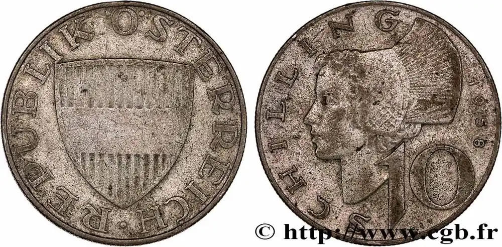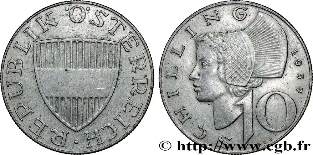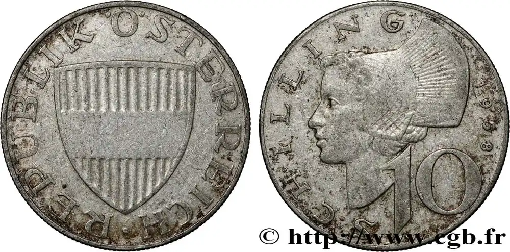 Type : 10 SchillingDate : 1957Quantité frappée : 15635000Métal : argentTitre en millième : 640 ‰Diamètre : 27 mmAxe des coins : 12 h.Poids : 7,498 g.Tranche : canneléeRéférence ouvrage :KM20/2882 AversTitulature avers : REPUBLIK ÖSTERREICH..Description avers : écu de l’Autriche.Traduction avers : (République d’Autriche).ReversTitulature revers : 10 SCHILLING (DATE).Description revers : femme coiffée du goldhaube traditionnel du Wachau.HistoriqueAUTRICHE