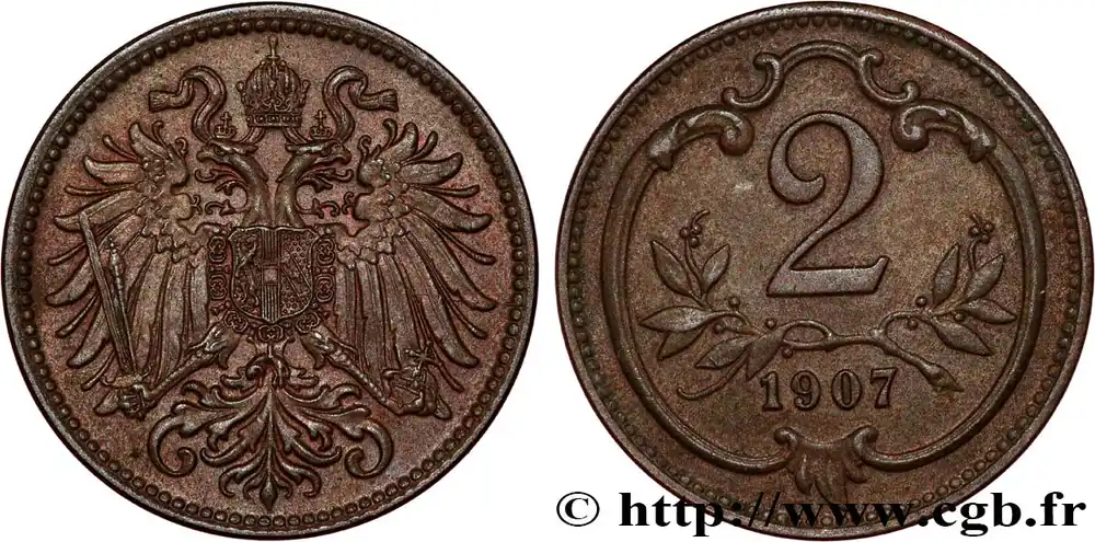 Type : 2 HellerDate : 1896Nom de l’atelier/ville : VienneQuantité frappée : 43080000 Métal : cuivreDiamètre : 18 mmAxe des coins : 12 h.Poids : 3,31 g.Tranche : striéeRéférence ouvrage :KM.19/2801 AversTitulature avers : ANÉPIGRAPHE.Description avers : Aigle héraldique couronné.ReversTitulature revers : 2 / 1896.Description revers : Dans un cartouche.HistoriqueAUTRICHE