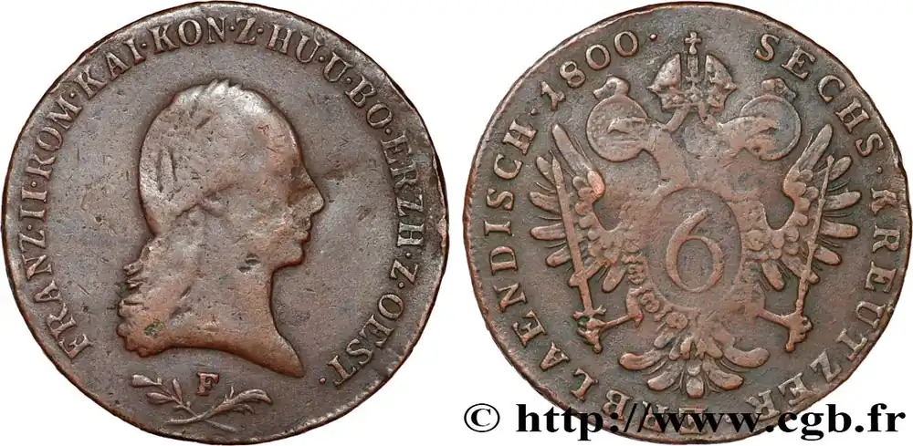 Type : 6 Kreuzer François IIDate : 1800Nom de l’atelier/ville : KremnitzQuantité frappée : 225017000Métal : cuivreDiamètre : 32,58 mmAxe des coins : 12 h.Poids : 13,05 g.Tranche : décoréeRéférence ouvrage :KM/WC.18/2128 AversTitulature avers : FRANZ. II. ROM. KAI. KON.. Z. HU. U. BO. ERZH. Z. OEST.Description avers : Tête nue nue de François II à droite /.ReversTitulature revers : SECHS. KREUTZER. ERBLAENDISCH. 1800.Description revers : Aigle bicéphale couronné.HistoriqueAUTRICHE
