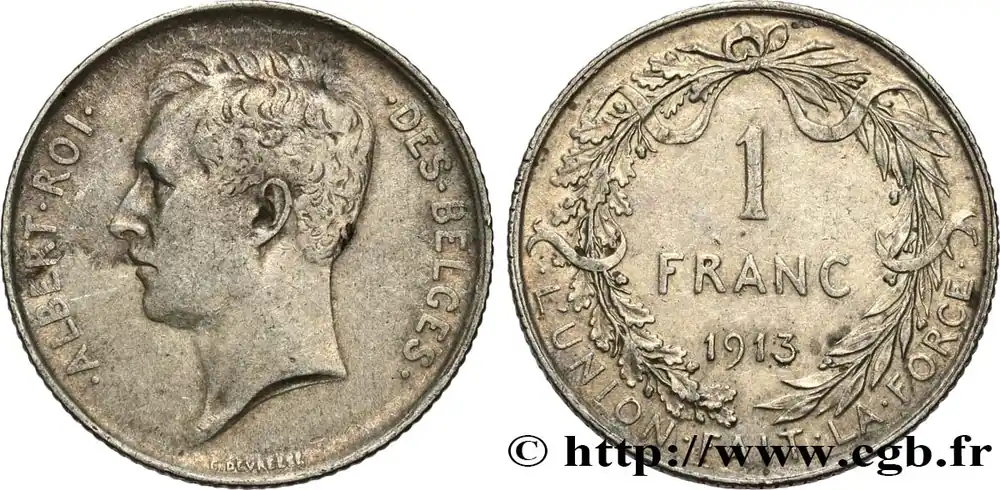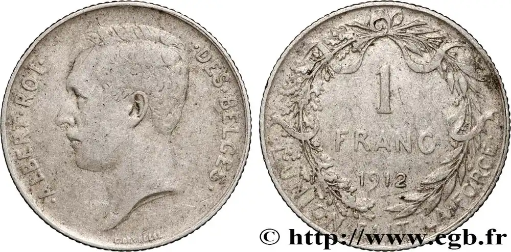 Type : 1 Franc Albert Ier légende françaiseDate : 1911Quantité frappée : 2810000Métal : argentTitre en millième : 835 ‰Diamètre : 23 mmAxe des coins : 6 h.Poids : 4,98 g.Tranche : canneléeRéférence ouvrage :KM20/72 AversTitulature avers : . ALBERT. ROI. – .DES. BELGES..Description avers : Tête nue à gauche d’Albert Ier.ReversTitulature revers : .L’UNION. FAIT. LA. FORCE..Description revers : 1 / FRANC / 1911 ; dans une couronne végétale composite.HistoriqueBELGIQUE
