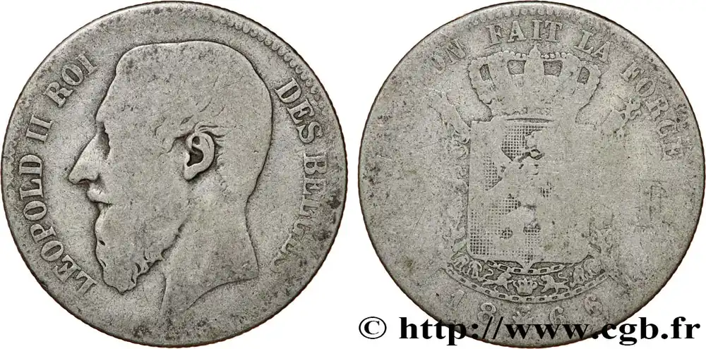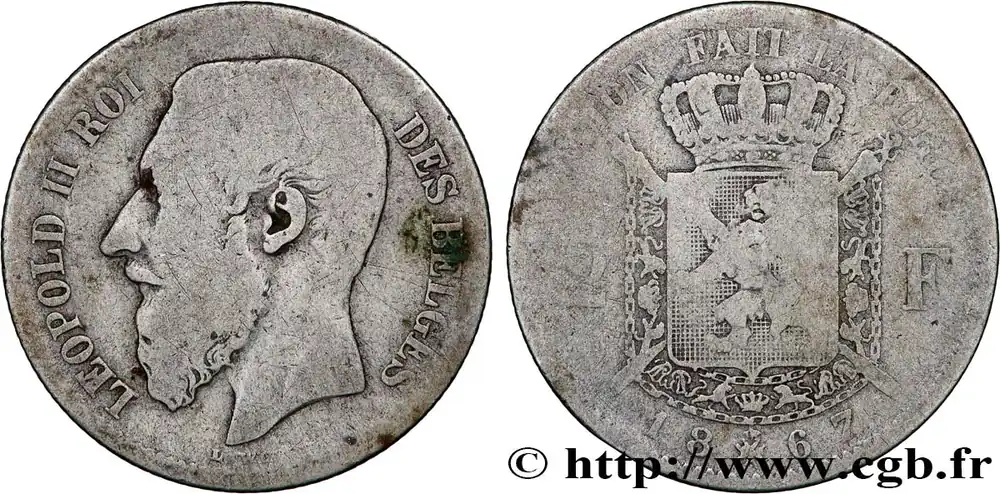 Type : 2 Francs Léopold II légende françaiseDate : 1866Quantité frappée : 1942000Métal : argentTitre en millième : 835 ‰Diamètre : 27 mmAxe des coins : 6 h.Poids : 9,65 g.Tranche : striéeRéférence ouvrage :KM.19/30.1 AversTitulature avers : LEOPOLD II ROI DES BELGES // L WIENER.Description avers : Tête nue de Léopold II à gauche.ReversTitulature revers : L’UNION FAIT LA FORCE.Description revers : Écu couronné aux armes de Belgique.CommentaireSignature à l’avers L WIENER.HistoriqueBELGIQUE