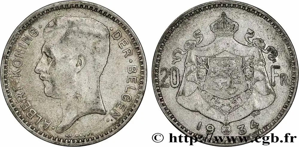 Type : 20 Francs Albert Ier légende FlamandeDate : 1934Quantité frappée : 12300000Métal : argentTitre en millième : 680 ‰Diamètre : 28 mmAxe des coins : 6 h.Poids : 11,00 g.Tranche : inscrite en creuxCommentaires sur l’état de conservation :Monnaie nettoyéeRéférence ouvrage :KM20/104 AversTitulature avers : · ALBERT·KONING · · DER·BELGEN · // DEVREESE.Description avers : Tête nue à gauche d’Albert.Traduction avers : (Albert roi des Belges).ReversTitulature revers : 20-FR / 19-34.Description revers : Armes couronnées de Belgique.CommentaireTranche position A : quand la monnaie est posée portrait en dessous, la légende de la tranche est à l’endroit.HistoriqueBELGIQUE
