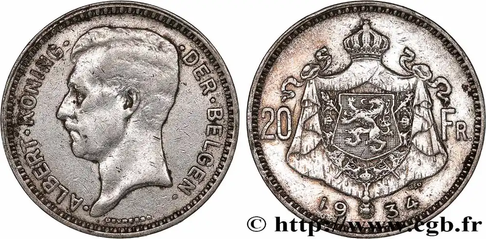 Type : 20 Francs Albert Ier légende FlamandeDate : 1934Quantité frappée : 12300000Métal : argentTitre en millième : 680 ‰Diamètre : 28 mmAxe des coins : 6 h.Poids : 10,77 g.Tranche : inscrite en creuxCommentaires sur l’état de conservation :Traces de nettoyageRéférence ouvrage :KM20/104 AversTitulature avers : · ALBERT·KONING · · DER·BELGEN · // DEVREESE.Description avers : Tête nue à gauche d’Albert.Traduction avers : (Albert roi des Belges).ReversTitulature revers : 20-FR / 19-34.Description revers : Armes couronnées de Belgique.CommentaireTranche position B : quand la monnaie est posée portrait en dessous, la légende de la tranche est à l’envers.HistoriqueBELGIQUE