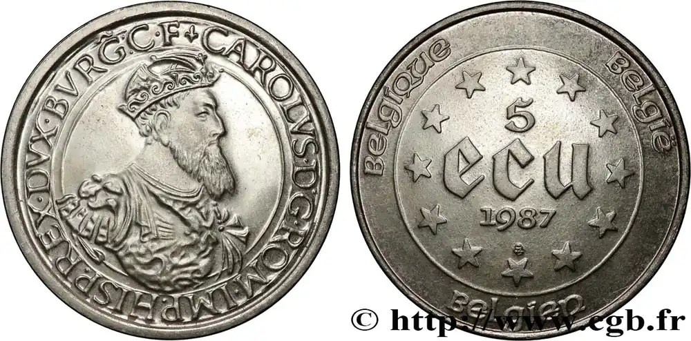 Type : 5 Ecu Charles QuintDate : 1987Quantité frappée : 985000Métal : argentTitre en millième : 833 ‰Diamètre : 37 mmAxe des coins : 6 h.Poids : 22,78 g.Tranche : lisseRéférence ouvrage :KM20/166 AversTitulature avers : CAROLVS.DG.ROM.IMP.HISP.REX.DVX.BVRG:G.F.Description avers : Buste de Charles Quint à droite.ReversTitulature revers : 5 ECU 1987 / BELGIQUE / BELGIE / BELGIEN.Description revers : dans le champ entouré d’étoiles.HistoriqueBELGIQUE
