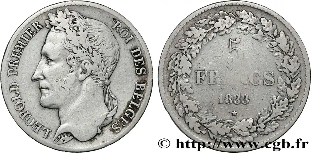 Type : 5 Francs Léopold IerDate : 1833Quantité frappée : 1125666Métal : argentTitre en millième : 900 ‰Diamètre : 37 mmAxe des coins : 6 h.Poids : 24,54 g.Tranche : en creuxCommentaires sur l’état de conservation :Léger nettoyageRéférence ouvrage :KM.19/3.1 AversTitulature avers : LEOPOLD PREMIER ROI DES BELGES.Description avers : tête à gauche laurée de Léopold Ier.ReversDescription revers : valeur faciale “5 Francs” et date au centre d’une couronne de feuilles de chêne.CommentairePosition A : lorsqu’on pose la pièce devant soi, le droit au-dessus, la légende sur la tranche peut se lire à l’envers.HistoriqueBELGIQUE