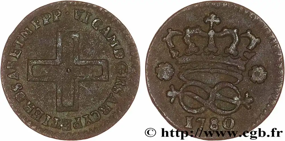 Type : 1 Liard Évéché de Liège frappe au nom de Jean-Théodore de BavièreDate : 1750Quantité frappée : -Métal : cuivreDiamètre : 23,16 mmAxe des coins : 6 h.Poids : 3,18 g.Tranche : lisseRéférence ouvrage :KM/WC.18/155 AversTitulature avers : I. THEOD. CAR. D. G. BAV. D.Description avers : Écu aux armes de Liège et de la Bavière.ReversTitulature revers : EP. ET. PRIN. LEO. DVX. B. M. F. C. L. H. .Description revers : 1 – 7 / 5 – 0 disposé entre cinq écus en 1, de Bouillon ; en 2 de Looz ;en 3, de Franchimont ;en 4, de Horn ; au centre de Liège.HistoriqueBELGIQUE – PRINCIPAUTÉ ÉPISCOPALE DE LIÈGE