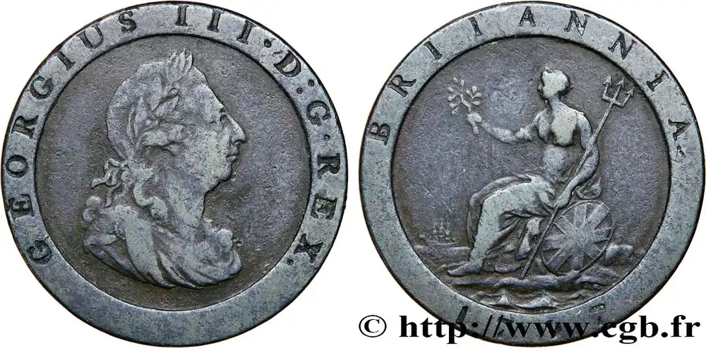 Type : 1 Penny Georges IIIDate : 1793Quantité frappée : -Métal : cuivreDiamètre : 30,50 mmAxe des coins : 6 h.Poids : 14,01 g.Tranche : lisseRéférence ouvrage :KM/WC.18/5 AversTitulature avers : GOERGIVS III . D . G . REX ..Description avers : portrait laurée de Georges III à droite.ReversTitulature revers : BERMUDA // 1793.Description revers : voilier à trois mâts naviguant vers la gauche.HistoriqueBERMUDES