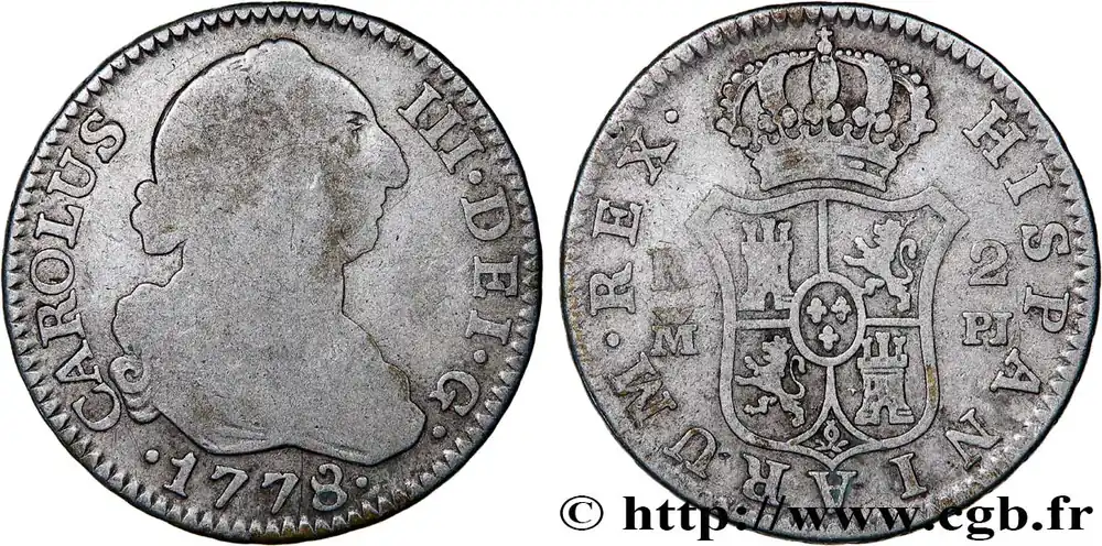 Type : 2 Reales Charles IIIDate : 1781Nom de l’atelier/ville : PotosiQuantité frappée : -Métal : argentDiamètre : 28,2 mmAxe des coins : 12 h.Poids : 6,44 g.Tranche : décoréeRéférence ouvrage :Cy11679 – KM18/53 AversTitulature avers : CAROLUS – III. DEI. G. 1781..Description avers : Buste à droite de Charles III.Traduction avers : (Charles III, par la grâce de Dieu).ReversTitulature revers : HISPANIARUM. REX. PTS 2 R· P · R ·.Description revers : Écu couronné aux armes de l’Espagne.HistoriqueBOLIVIE