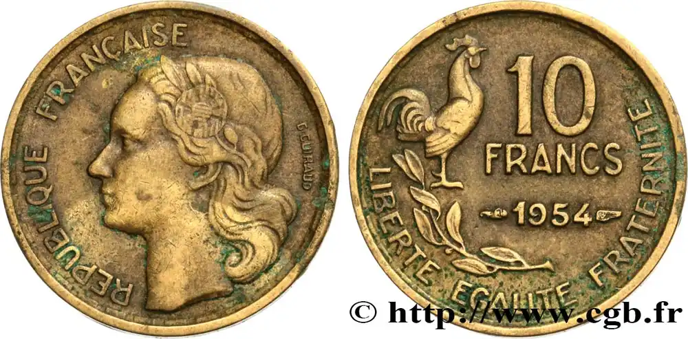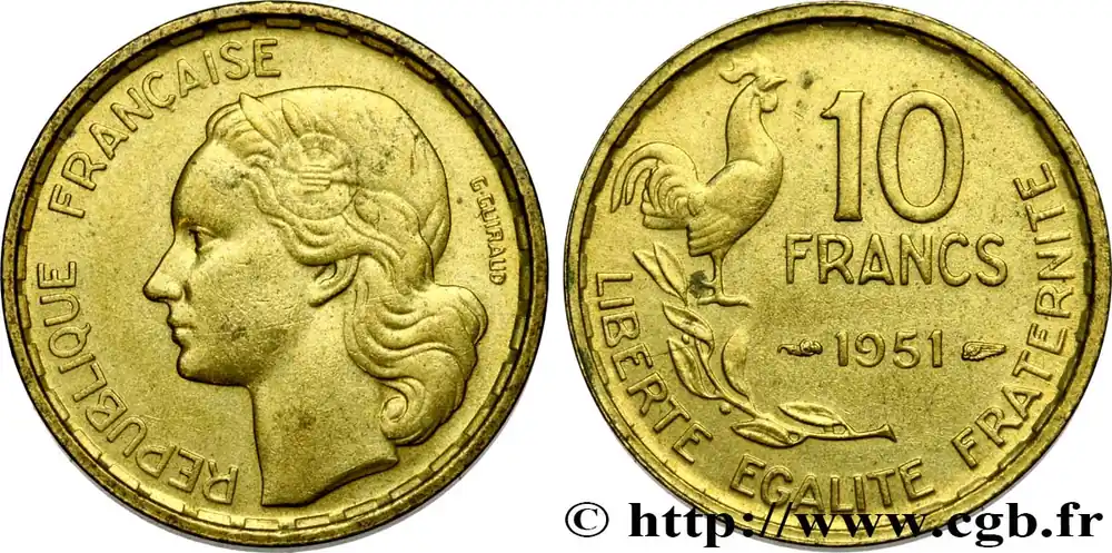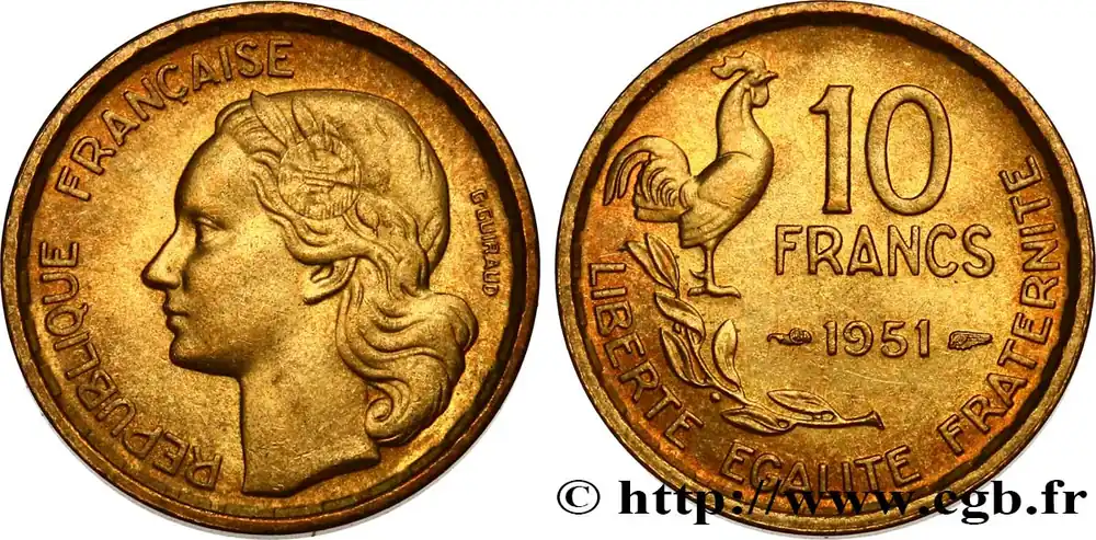 Type : 10 francs GuiraudDate : 1951Quantité frappée : 153.689.000Métal : bronze-aluminiumDiamètre : 20 mmAxe des coins : 6 h.Poids : 2,99 g.Tranche : lisseRéférence ouvrage :Classement FRANC 2023 / FRANC 2023 classificationF.363/4AversTitulature avers : RÉPUBLIQUE FRANÇAISE.Description avers : Tête de Marianne à gauche, coiffée du bonnet phrygien orné d’une cocarde ; signé G GUIRAUD derrière.ReversTitulature revers : 10 / FRANCS / 1951 // LIBERTE EGALITE FRATERNITE.Description revers : Coq debout à droite au-dessus d’une branche d’olivier.HistoriqueQUATRIÈME RÉPUBLIQUE(16/01/1947-8/01/1959) Se caractérisant par un régime parlementaire doublé d’une grande instabilité ministérielle, la Quatrième République a pour particularité de n’avoir jamais été officiellement proclamée. En effet, De Gaulle, lors de son arrivée à Paris le 25 août 1944, refuse de le faire sous prétexte que la République n’avait jamais cessé d’exister. Considérant que l’État français du maréchal Pétain n’était qu’un simple état de fait, il estime que la République a survécu dans la France libre et son acte de naissance doit alors être le 18 juin 1940. Toutefois, son départ, le 20 janvier 1946, et le référendum du 13 octobre 1946 approuvant une nouvelle Constitution, marquent le début officiel de cette république. Elle connaît deux présidents : Vincent Auriol (16/01/1947 – 23/12/1953) et René Coty (23/12/1953 – 8/1/1959). La crise ouverte causée par la révolte de l’armée d’Algérie entraîne, en 1958, sa chute qui est confirmée par l’adoption d’une nouvelle constitution le 28 septembre 1958. Néanmoins, elle ne cesse définitivement d’être que le 8 janvier 1959 lors de l’installation du général de Gaulle comme président de la Ve République.