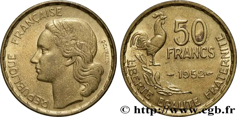 Type : 50 francs GuiraudDate : 1953Quantité frappée : 63.171.600Métal : bronze-aluminiumDiamètre : 27 mmAxe des coins : 6 h.Poids : 7,98 g.Tranche : lisseCommentaires sur l’état de conservation :Traces de nettoyage et rayures sur le portraitRéférence ouvrage :Classement FRANC 2023 / FRANC 2023 classificationF.425/10AversTitulature avers : REPUBLIQUE FRANÇAISE.Description avers : tête de Marianne aux cheveux longs à gauche, couronnée d’une branche d’olivier portant fruit, ornée d’une cocarde tricolore (centre guilloché horizontalement, cercle ondulé, cercle guilloché verticalement) ; signé G. GUIRAUD derrière, le long du listel.ReversTitulature revers : LIBERTE EGALITE FRATERNITE.Description revers : 50 / FRANCS / (millésime) encadré des différents ; coq debout à droite au-dessus d’une branche de laurier vers la gauche.HistoriqueQUATRIÈME RÉPUBLIQUE(16/01/1947-8/01/1959) Se caractérisant par un régime parlementaire doublé d’une grande instabilité ministérielle, la Quatrième République a pour particularité de n’avoir jamais été officiellement proclamée. En effet, De Gaulle, lors de son arrivée à Paris le 25 août 1944, refuse de le faire sous prétexte que la République n’avait jamais cessé d’exister. Considérant que l’État français du maréchal Pétain n’était qu’un simple état de fait, il estime que la République a survécu dans la France libre et son acte de naissance doit alors être le 18 juin 1940. Toutefois, son départ, le 20 janvier 1946, et le référendum du 13 octobre 1946 approuvant une nouvelle Constitution, marquent le début officiel de cette république. Elle connaît deux présidents : Vincent Auriol (16/01/1947 – 23/12/1953) et René Coty (23/12/1953 – 8/1/1959). La crise ouverte causée par la révolte de l’armée d’Algérie entraîne, en 1958, sa chute qui est confirmée par l’adoption d’une nouvelle constitution le 28 septembre 1958. Néanmoins, elle ne cesse définitivement d’être que le 8 janvier 1959 lors de l’installation du général de Gaulle comme président de la Ve République.