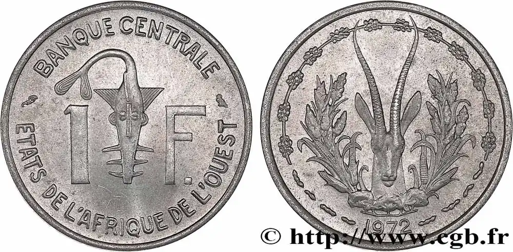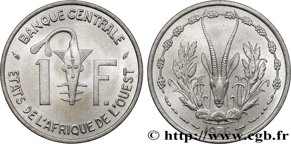 Type : 1 Franc BCEAODate : 1975Nom de l’atelier/ville : ParisQuantité frappée : 18080000Métal : aluminiumDiamètre : 23 mmAxe des coins : 6 h.Poids : 1,30 g.Tranche : lisseRéférence ouvrage :KM20/3.1 AversTitulature avers : BANQUE CENTRALE // 1 – F //ETATS DE L’AFRIQUE DE L’OUEST.Description avers : Emblème de la BCEAO (poids d’or des Ashaties représentant un poisson-scie).ReversTitulature revers : 1975.Description revers : Tête de gazelle des sables, tiges de maïs, de mil et branches de cotonnier entourés d’une frise décorative composée de grains de café et d’arachides..HistoriqueÉTATS DE L’AFRIQUE DE L’OUEST (BCEAO)(1956-) La Banque centrale des États de l’Afrique de l’Ouest (BCEAO) est la principale institution monétaire de l’Union économique et monétaire ouest-africaine (UEMOA) qui comprend le Bénin, le Burlina-Faso, la Côte d’Ivoire, le Mali, le Niger, le Sénégal et le Togo. Son siège est situé à Dakar. Elle fait suite à l’Institut d’émission de l’Afrique-Occidentale française et du Togo. La Banque de France garantit la convertibilité du Franc CFA en Franc français puis à partir de 1999 en Euro.