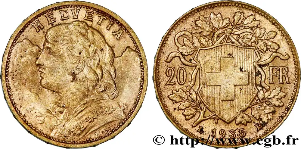 Type : 20 Francs « Vreneli » Date : 1935Nom de l’atelier/ville : BerneQuantité frappée : 20008813Métal : orTitre en millième : 900 ‰Diamètre : 21 mmAxe des coins : 6 h.Poids : 6,44 g.Tranche : étoilée en reliefRéférence ouvrage :KM20/35.1  – HMZ.2-1186  – F.499  – OC.7.27a AversTitulature avers : HELVETIA.Description avers : Buste de jeune fille à gauche devant un paysage montagneux ; au-dessous signature F. LANDRY.ReversTitulature revers : 20 – FR/ L 1935 B.Description revers : Écu posé sur une branche de chêne.HistoriqueOR, PALLADIUM ET PLATINE INVESTISSEMENTSécurisez et diversifiez votre épargne avec les métaux précieux :Dans un contexte d’instabilité politique et économique croissante, diversifier son épargne peut être une démarche judicieuse. Les métaux précieux comme l’or, le palladium et le platine constituent des actifs tangibles souvent prisés en raison de leur caractère intemporel et de leur résilience face aux fluctuations des marchés.Pour répondre à des besoins variés, l’achat de pièces officielles en or, palladium ou platine est une option flexible et adaptée. Ces pièces, disponibles à l’unité ou en lot, permettent à chacun d’ajuster ses choix selon ses objectifs et son budget, sans engagement à long terme.Un processus simple et sécurisé :Nous proposons une livraison sécurisée et garantie. Les paiements peuvent être effectués par carte bancaire ou par virement, bien que certaines transactions puissent nécessiter un règlement exclusivement par virement bancaire. Une pièce d’identité valide (carte nationale d’identité ou passeport) sera demandée pour finaliser votre achat.Stockage en toute sécurité et confidentialité :Le département Investissement de CGB Numismatique Paris met à votre disposition des solutions de stockage offrant une sécurité renforcée et une confidentialité optimale pour vos achats en or, palladium et platine.Contactez-nous pour plus d’informations :Pour toute question ou pour passer commande, prenez contact avec notre responsable des achats/ventes de métaux précieux : par email à [email protected] ou par téléphone. Nous mettons à votre disposition des informations générales et des services pour vous accompagner dans vos projets d’investissement.CGB Numismatique Paris agit en tant que fournisseur de métaux précieux et ne fournit aucun conseil en investissement. La valeur des métaux précieux peut fluctuer, et les performances passées ne garantissent pas les résultats futurs. L’achat de métaux précieux doit être considéré comme une stratégie de préservation de valeur plutôt qu’un investissement spéculatif. Conformément à l’article L.221-28 du Code de la consommation, le droit de rétractation ne s’applique pas aux achats d’or d’investissement, dont le prix dépend des fluctuations des marchés financiers.