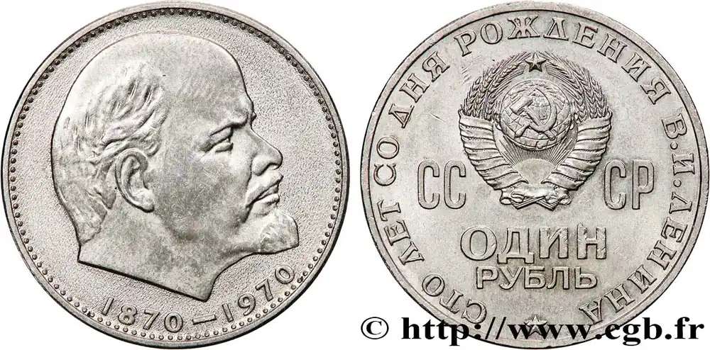 Type : 1 Rouble URSS 100e anniversaire de la naissance de LénineDate : 1970Quantité frappée : 99989000Métal : cupro-nickel-zincDiamètre : 31 mmAxe des coins : 12 h.Poids : 12,40 g.Tranche : inscrite en creuxCommentaires sur l’état de conservation :monnaie nettoyéeRéférence ouvrage :KM20/141 AversTitulature avers : (LÉGENDE EN CYRILLIQUE) СТО ЛЕТ СО ДНЯ РОЖДЕНИЯ В.И.ЛЕНИНА // СС – СР // ОДИН / РУБЛЬ.Description avers : armoiries de l’URSS.Légende avers : СТО ЛЕТ СО ДНЯ РОЖДЕНИЯ В.И.ЛЕНИНА // СС – СР // ОДИН / РУБЛЬReversTitulature revers : 1870-1970.Description revers : buste à droite de Lénine.HistoriqueRUSSIE – URSS(1922-1991) La Révolution de Février 1917 met fin au régime des tsars de Russie. La République Russe est renversée par les bolcheviks en Octobre 1917. Le 30 décembre 1922, est signé le traité relatif à la formation de l’Union des Républiques Socialistes Soviétiques (URSS). Bien que disposant d’un chef de l’état et d’un chef du gouvernement, l’URSS est en fait dirigé par le chef du Parti communiste de l’Union soviétique, seul parti autorisé entre 1925 et 1990.Le 8 décembre 1991, les présidents de Russie, d’Ukraine et de Biélorussie signent les Accord de Minsk qui proclame la dissolution de l’URSS par ses États fondateurs.