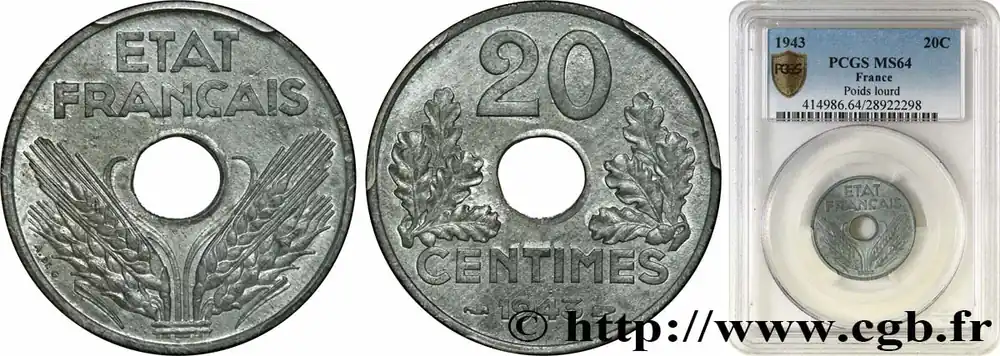 Type : 20 centimes Cérès, IIe RépubliqueDate : 1850Nom de l’atelier/ville : ParisQuantité frappée : inclusMétal : argentDiamètre : 15 mmAxe des coins : 6 h.Poids : 1 g.Tranche : canneléeCommentaires sur l’état de conservation :Traces de nettoyageRéférence ouvrage :Classement FRANC 2023 / FRANC 2023 classificationF.146/3AversTitulature avers : REPUBLIQUE * FRANÇAISE..Description avers : Tête de la République à gauche en Cérès, déesse des moissons, portant un collier de perles, un double chignon et une couronne composite de blé, fleurs, olivier et olives, chêne et glands, nouée par un ruban descendant sur le cou et passant sur le front où est inscrit le mot CONCOR ; sous la tranche du cou le long du listel E. A.OUDINÉ. F..ReversTitulature revers : (DIFFÉRENT) (DEUX GLANDS SUR UNE BRANCHE) LIBERTE . EGALITE . FRATERNITE (DIFFÉRENT).Description revers : 20 / CENT., en deux lignes dans le champ, au-dessus du millésime, dans une couronne composite de deux branches de chêne et de deux de laurier, nouées deux par deux en bas par un ruban ; sous le nœud, la lettre d’atelier.CommentaireExemplaire avec l’oreille basse.HistoriqueDEUXIÈME RÉPUBLIQUE(24/02/1848-2/12/1852) Lors de la révolution de février 1848, Louis-Philippe abdique en faveur de son petit-fils mais celui-ci n’est pas reconnu par les Chambres et, le 24 février, la République est proclamée par un décret du gouvernement provisoire. Celui-ci a proclamé la liberté du travail, la suppression de la peine de mort en matière politique, le suffrage universel. Les ateliers nationaux sont créés en mars 1848. Des élections ont lieu dès avril et aboutissent au succès des républicains modérés. La fermeture des ateliers nationaux provoque des émeutes qui sont réprimées dans le sang par le général Cavaignac qui est nommé président du conseil. Les révoltés sont exécutés, emprisonnés, déportés. Le pouvoir législatif est confié à une assemblée unique alors que le président de la République, élu au suffrage universel, détient l’exécutif. Ce dernier est le prince Louis Napoléon. Il entre en conflit avec l’assemblée dès 1850 car sa réélection est anticonstitutionnelle. Louis Napoléon s’engage alors dans la préparation du coup d’État qui lui permet, le 2 décembre 1851, d’installer sa dictature. En novembre 1852, il est proposé de rétablir la dignité impériale héréditaire. Le plébiscite des 21-22 novembre donne près de huit millions de oui pour l’Empire tandis que le non ne recueillait qu’environ 250.000 voix. Le 2 décembre 1852, Louis Napoléon est proclamé empereur sous le nom de Napoléon III.