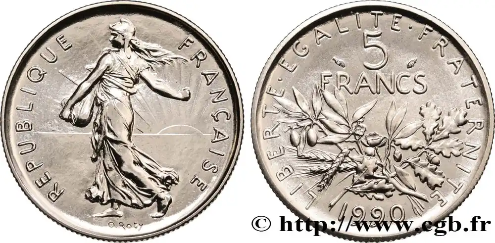 Type : 5 francs Semeuse, nickelDate : 1980Quantité frappée : 60000Métal : cupro-nickelDiamètre : 29 mmAxe des coins : 6 h.Poids : 10 g.Tranche : striéeDegré de rareté : R1Référence ouvrage :Classement FRANC 2023 / FRANC 2023 classificationF.341/12AversTitulature avers : REPUBLIQUE FRANÇAISE.Description avers : La République à gauche, sous les traits d’une semeuse drapée et coiffée d’un bonnet phrygien, aux cheveux longs, marchant et semant à contre-vent ; en arrière-plan, derrière la semeuse à droite, un soleil levant ; au-dessous, en creux O. ROTY.ReversTitulature revers : LIBERTE . EGALITE . FRATERNITE / 1980.Description revers : 5 / FRANCS entre corne et chouette, au-dessus d’un bouquet d’épis de blé, d’une branche d’olivier chargée de fruits, d’une branche de chêne et d’un coquelicot, le millésime sous le bouquet.CommentaireExemplaire sous plastique provenant d’une série Fleurs De Coins.HistoriqueCINQUIÈME RÉPUBLIQUE(depuis le 08/01/1959) La Cinquième République, dont la constitution a été approuvée par référendum le 28 septembre 1958 par plus de 79 % des Français, ne débute officiellement qu’avec l’installation du général de Gaulle comme président le 8 janvier 1959. La constitution est modifiée le 28 octobre 1962 par référendum où une majorité de 62 % des voix approuve l’élection du président de la République au suffrage universel direct. Les différents présidents de la Ve République sont Charles de Gaulle (8/01/1959 – 27/04/1969, retrait et Alain Poher devient président par intérim), Georges Pompidou (15/06/1969 – 2/04/1974, décédé, Alain Poher devient président par intérim), Valéry Giscard d’Estaing (19/05/1974 – 21/05/1981), François Mitterrand (21/05/1981 – 7/05/1995), Jacques Chirac (7/05/1995 – 16/05/2007) , Nicolas Sarkozy (16/05/2007 – 15/05/2012), François Hollande (15/05/2012 – 14/05/2017) et Emmanuel Macron (14/05/2017 – ).
