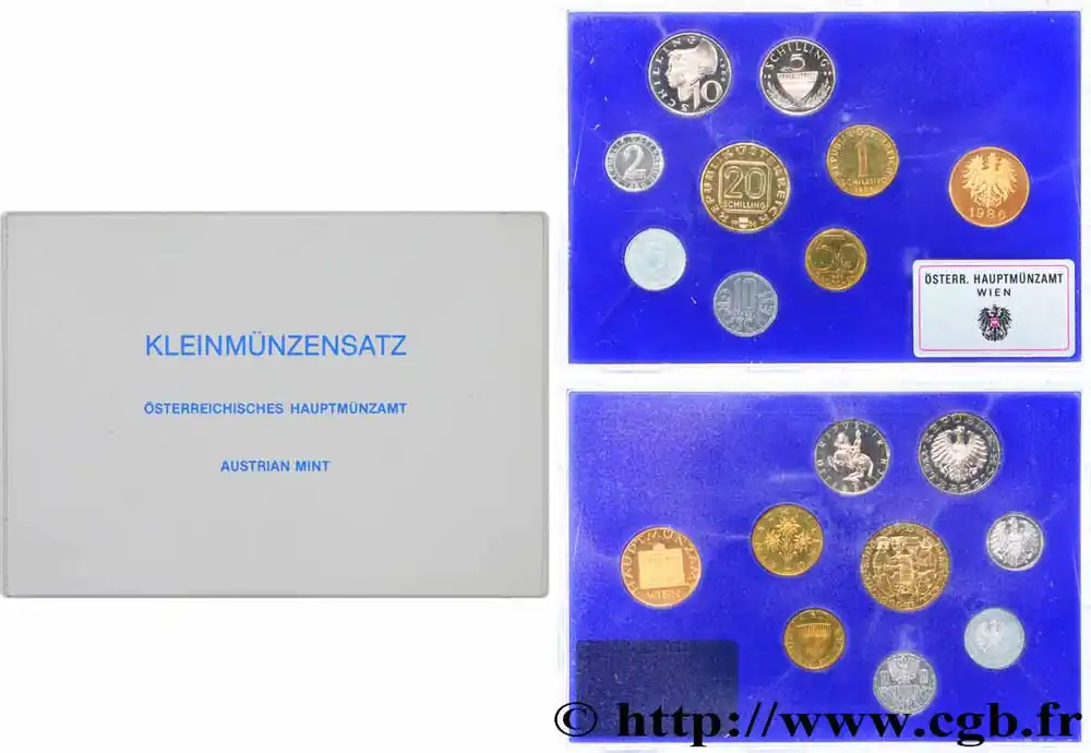 Type : Série Proof 8 MonnaiesDate : 1983Nom de l’atelier/ville : VienneQuantité frappée : 65000Commentaires sur l’état de conservation :Cartonnage de seconde mainRéférence ouvrage :KM20/PS44 AversReversCommentaireCette série est composée de 8 monnaies :- 2, 5 et 10 Groschen aluminium- 50 Groschen bronze-aluminium- 1 Schilling bronze-aluminium- 5 et 10 Schilling cupro-nickel- 20 Schilling cupro-aluminium-nickel Château de Hochostewitz.HistoriqueAUTRICHE
