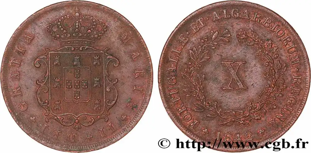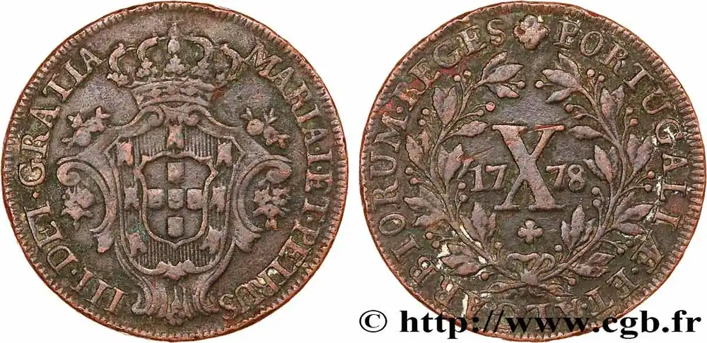Type : 10 Réis Date : 1778Nom de l’atelier/ville : LisbonneQuantité frappée : -Métal : cuivreDiamètre : 31 mmAxe des coins : 12 h.Poids : 6,47 g.Tranche : lisseCommentaires sur l’état de conservation :Métal piquéRéférence ouvrage :Gom.04.01 AversTitulature avers : MARIA.I.E.PETRUS.III.D.G.P.E.BRASIL.REGES // +X+ / +1778+.Description avers : couronne.ReversTitulature revers : PECUNIA.TOTUM.CIRCUMIT.ORBEM.Description revers : sphère armillaire.HistoriqueBRÉSIL – MARIE Ire et PIERRE III(1777-1786) Marie a succédé à Joseph Ier en 1777. Pierre III, son mari, lui est associé jusqu’en 1786, date de sa mort. Marie règne jusqu’en 1805, mais, en fait, le prince Jean est régent à partir de 1799 et le restera jusqu’en 1818.