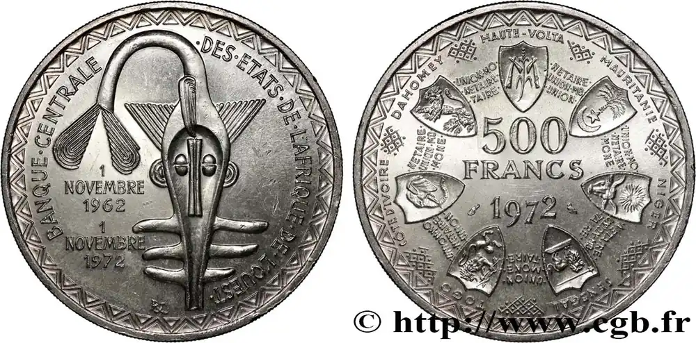 Type : 500 Francs BCEAODate : 1972Nom de l’atelier/ville : ParisQuantité frappée : 100000Métal : argentTitre en millième : 900 ‰Diamètre : 37 mmAxe des coins : 6 h.Poids : 25 g.Tranche : striéeRéférence ouvrage :KM20/7 AversTitulature avers : BANQUE . CENTRALE . DES . ÉTATS . DE . L’AFRIQUE . DE . L’OUEST. // 1/NOVEMBRE/1962 // 1/NOVEMBRE/1972.Description avers : logo de la BCEAO.ReversTitulature revers : HAUTE – VOLTA/ MAURITANIE / NIGER / SENEGAL / TOGO / COTE D’IVOIRE / DAHOMEY /SOUS UNE FRISE ET AUTOUR D’UN COLLIER DE BLASON LIÉS PAR LA LÉGENDE RÉPÉTÉE UNION MONÉTAIRE OUEST-AFRICAINE / 500 / FRANCS / 1972.Description revers : Collier de blasons.HistoriqueÉTATS DE L’AFRIQUE DE L’OUEST (BCEAO)(1956-) La Banque centrale des États de l’Afrique de l’Ouest (BCEAO) est la principale institution monétaire de l’Union économique et monétaire ouest-africaine (UEMOA) qui comprend le Bénin, le Burlina-Faso, la Côte d’Ivoire, le Mali, le Niger, le Sénégal et le Togo. Son siège est situé à Dakar. Elle fait suite à l’Institut d’émission de l’Afrique-Occidentale française et du Togo. La Banque de France garantit la convertibilité du Franc CFA en Franc français puis à partir de 1999 en Euro.