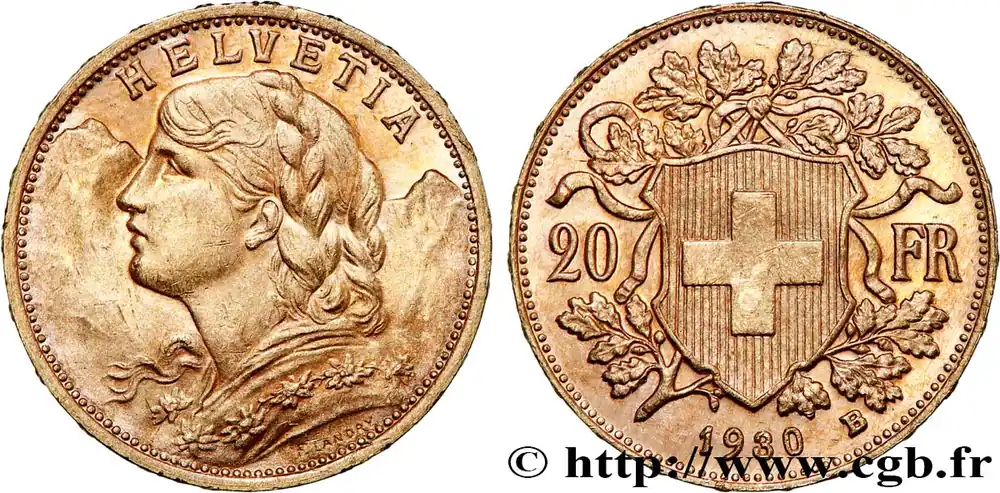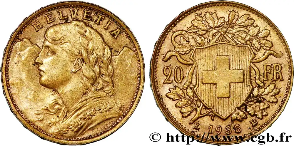 Type : 20 Francs « Vreneli » Date : 1935Nom de l’atelier/ville : BerneQuantité frappée : 20008813Métal : orTitre en millième : 900 ‰Diamètre : 21 mmAxe des coins : 6 h.Poids : 6,45 g.Tranche : étoilée en reliefRéférence ouvrage :KM20/35.1 – HMZ.2-1186 – F.499 – OC.7.27a AversTitulature avers : HELVETIA.Description avers : Buste de jeune fille à gauche devant un paysage montagneux ; au-dessous signature F. LANDRY.ReversTitulature revers : 20 – FR/ L 1935 B.Description revers : Écu posé sur une branche de chêne.HistoriqueOR, PALLADIUM ET PLATINE INVESTISSEMENTSécurisez et diversifiez votre épargne avec les métaux précieux :Dans un contexte d’instabilité politique et économique croissante, diversifier son épargne peut être une démarche judicieuse. Les métaux précieux comme l’or, le palladium et le platine constituent des actifs tangibles souvent prisés en raison de leur caractère intemporel et de leur résilience face aux fluctuations des marchés.Pour répondre à des besoins variés, l’achat de pièces officielles en or, palladium ou platine est une option flexible et adaptée. Ces pièces, disponibles à l’unité ou en lot, permettent à chacun d’ajuster ses choix selon ses objectifs et son budget, sans engagement à long terme.Un processus simple et sécurisé :Nous proposons une livraison sécurisée et garantie. Les paiements peuvent être effectués par carte bancaire ou par virement, bien que certaines transactions puissent nécessiter un règlement exclusivement par virement bancaire. Une pièce d’identité valide (carte nationale d’identité ou passeport) sera demandée pour finaliser votre achat.Stockage en toute sécurité et confidentialité :Le département Investissement de CGB Numismatique Paris met à votre disposition des solutions de stockage offrant une sécurité renforcée et une confidentialité optimale pour vos achats en or, palladium et platine.Contactez-nous pour plus d’informations :Pour toute question ou pour passer commande, prenez contact avec notre responsable des achats/ventes de métaux précieux : par email à [email protected] ou par téléphone. Nous mettons à votre disposition des informations générales et des services pour vous accompagner dans vos projets d’investissement.CGB Numismatique Paris agit en tant que fournisseur de métaux précieux et ne fournit aucun conseil en investissement. La valeur des métaux précieux peut fluctuer, et les performances passées ne garantissent pas les résultats futurs. L’achat de métaux précieux doit être considéré comme une stratégie de préservation de valeur plutôt qu’un investissement spéculatif. Conformément à l’article L.221-28 du Code de la consommation, le droit de rétractation ne s’applique pas aux achats d’or d’investissement, dont le prix dépend des fluctuations des marchés financiers.
