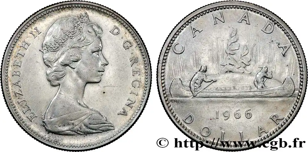 Type : 1 Dollar Elisabeth IIDate : 1959Quantité frappée : 1443502Métal : argentTitre en millième : 800 ‰Diamètre : 36 mmAxe des coins : 12 h.Poids : 23,27 g.Tranche : canneléeRéférence ouvrage :KM20/54 AversTitulature avers : ELIZABETH II DEI GRATIA REGINA.Description avers : Buste d’Elisabeth II à droite.ReversTitulature revers : CANADA / DOLLAR / 1959.Description revers : Canoë voguant à droite.HistoriqueCANADAC’est le 15 février 1965, sur la colline du Parlement à Ottawa, que se déroule la cérémonie d’inauguration du drapeau canadien, en présence du gouverneur général Georges Vanier, du premier ministre Lester B. Pearson et des membres du Cabinet, ainsi que de milliers de citoyens. On descend d’abord le Red Ensign, portant l’Union Jack et l’écu des armoiries royales du Canada. Puis, sur le coup de midi, on hisse l’unifolié. La foule entonne ensuite l’hymne national O Canada suivi de l’hymne royal God save the Queen. Les paroles prononcées ce jour-là par Maurice Bourget, président du Sénat, donnent un sens encore plus symbolique à ce drapeau : « Le drapeau est le symbole de l’unité de la nation, car il représente sans l’ombre d’un doute tous les citoyens du Canada, sans distinction de race, de langue, de croyance ou d’opinion ».Deuxième pays du monde par sa superficie, le Canada occupe la majeure partie de l’Amérique du Nord. Il s’étend d’est en ouest de l’océan Atlantique à l’océan Pacifique et vers le nord jusqu’à l’océan Arctique et il partage deux frontières avec les États-Unis au sud et au nord-ouest (Alaska). D’abord occupé par les peuples autochtones, le pays est né de l’union de trois colonies britanniques, lesquelles étaient des colonies françaises au temps de la Nouvelle-France. Aujourd’hui c’est un État fédéral de dix provinces et trois territoires. Le Canada a obtenu son indépendance du Royaume-Uni pacifiquement dans un processus qui s’est étalé de 1867 à 1982.