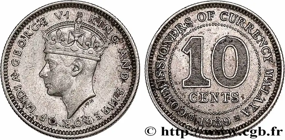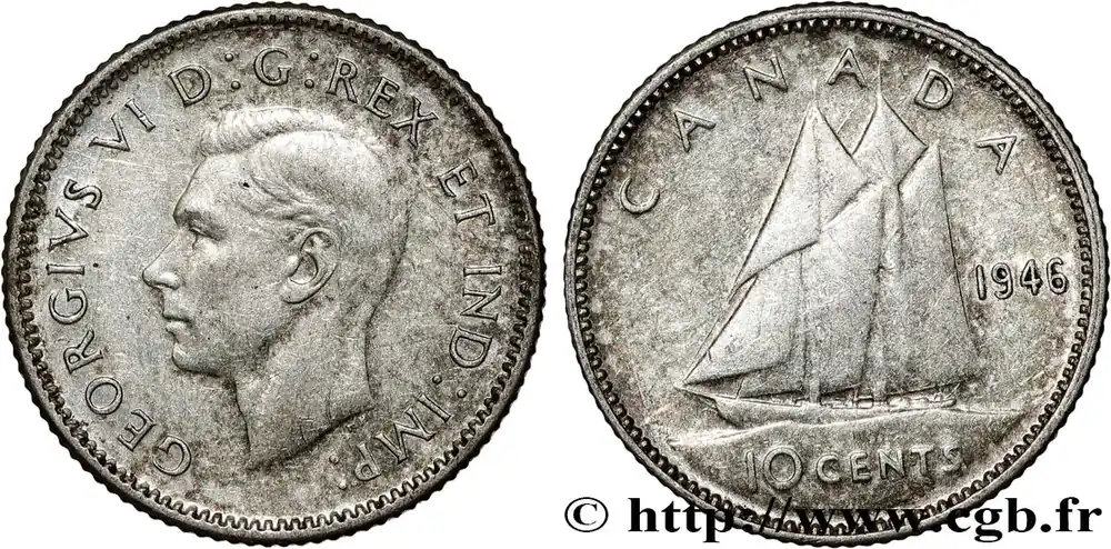 Type : 10 Cents Georges VIDate : 1937Quantité frappée : 2500095Métal : argentTitre en millième : 800 ‰Diamètre : 18 mmAxe des coins : 12 h.Poids : 2,29 g.Tranche : striéeRéférence ouvrage :KM20/34 AversTitulature avers : GEORGIVS VI D : G : REX ET IND : IMP :.Description avers : Tête de George VI à gauche ; initiales des graveurs sous le buste.ReversTitulature revers : CANADA / 1937 / 10CENTS.Description revers : Voilier voguant à gauche.HistoriqueCANADAC’est le 15 février 1965, sur la colline du Parlement à Ottawa, que se déroule la cérémonie d’inauguration du drapeau canadien, en présence du gouverneur général Georges Vanier, du premier ministre Lester B. Pearson et des membres du Cabinet, ainsi que de milliers de citoyens. On descend d’abord le Red Ensign, portant l’Union Jack et l’écu des armoiries royales du Canada. Puis, sur le coup de midi, on hisse l’unifolié. La foule entonne ensuite l’hymne national O Canada suivi de l’hymne royal God save the Queen. Les paroles prononcées ce jour-là par Maurice Bourget, président du Sénat, donnent un sens encore plus symbolique à ce drapeau : « Le drapeau est le symbole de l’unité de la nation, car il représente sans l’ombre d’un doute tous les citoyens du Canada, sans distinction de race, de langue, de croyance ou d’opinion ».Deuxième pays du monde par sa superficie, le Canada occupe la majeure partie de l’Amérique du Nord. Il s’étend d’est en ouest de l’océan Atlantique à l’océan Pacifique et vers le nord jusqu’à l’océan Arctique et il partage deux frontières avec les États-Unis au sud et au nord-ouest (Alaska). D’abord occupé par les peuples autochtones, le pays est né de l’union de trois colonies britanniques, lesquelles étaient des colonies françaises au temps de la Nouvelle-France. Aujourd’hui c’est un État fédéral de dix provinces et trois territoires. Le Canada a obtenu son indépendance du Royaume-Uni pacifiquement dans un processus qui s’est étalé de 1867 à 1982.
