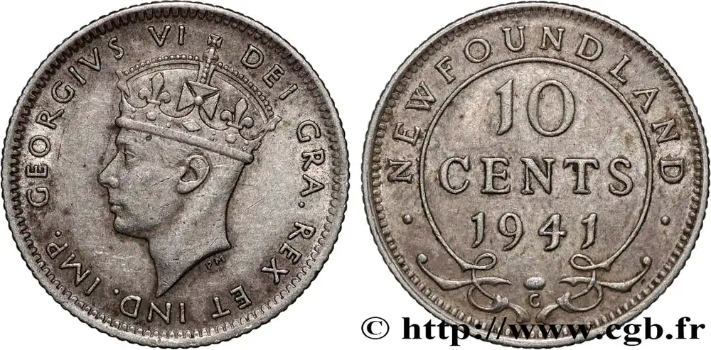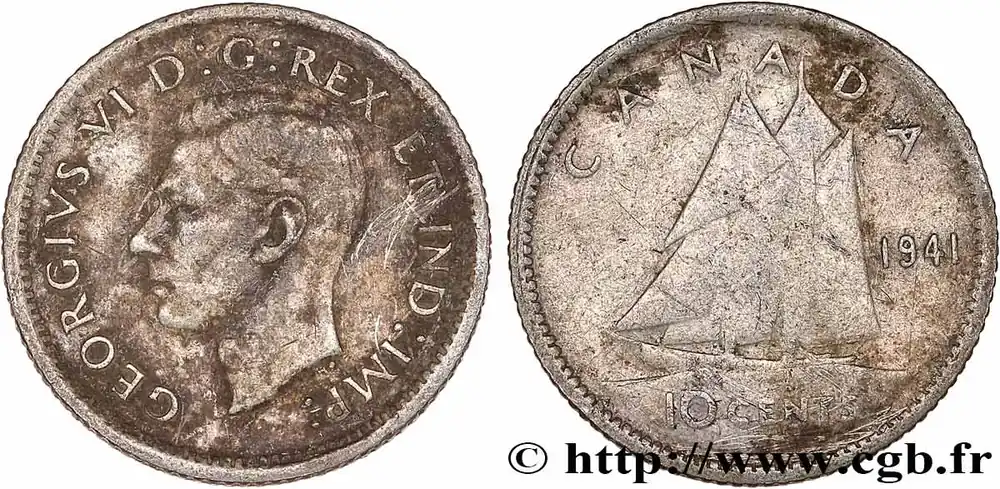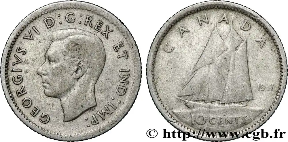 Type : 10 Cents Georges VIDate : 1944Quantité frappée : 9383582Métal : argentTitre en millième : 800 ‰Diamètre : 18 mmAxe des coins : 12 h.Poids : 2,24 g.Tranche : striéeCommentaires sur l’état de conservation :Monnaie nettoyéeRéférence ouvrage :KM20/34 AversTitulature avers : GEORGIVS VI D : G : REX ET IND : IMP :.Description avers : Tête de George VI à gauche ; initiales des graveurs sous le buste.ReversTitulature revers : CANADA / 1944 / 10CENTS.Description revers : Voilier voguant à gauche.HistoriqueCANADAC’est le 15 février 1965, sur la colline du Parlement à Ottawa, que se déroule la cérémonie d’inauguration du drapeau canadien, en présence du gouverneur général Georges Vanier, du premier ministre Lester B. Pearson et des membres du Cabinet, ainsi que de milliers de citoyens. On descend d’abord le Red Ensign, portant l’Union Jack et l’écu des armoiries royales du Canada. Puis, sur le coup de midi, on hisse l’unifolié. La foule entonne ensuite l’hymne national O Canada suivi de l’hymne royal God save the Queen. Les paroles prononcées ce jour-là par Maurice Bourget, président du Sénat, donnent un sens encore plus symbolique à ce drapeau : « Le drapeau est le symbole de l’unité de la nation, car il représente sans l’ombre d’un doute tous les citoyens du Canada, sans distinction de race, de langue, de croyance ou d’opinion ».Deuxième pays du monde par sa superficie, le Canada occupe la majeure partie de l’Amérique du Nord. Il s’étend d’est en ouest de l’océan Atlantique à l’océan Pacifique et vers le nord jusqu’à l’océan Arctique et il partage deux frontières avec les États-Unis au sud et au nord-ouest (Alaska). D’abord occupé par les peuples autochtones, le pays est né de l’union de trois colonies britanniques, lesquelles étaient des colonies françaises au temps de la Nouvelle-France. Aujourd’hui c’est un État fédéral de dix provinces et trois territoires. Le Canada a obtenu son indépendance du Royaume-Uni pacifiquement dans un processus qui s’est étalé de 1867 à 1982.