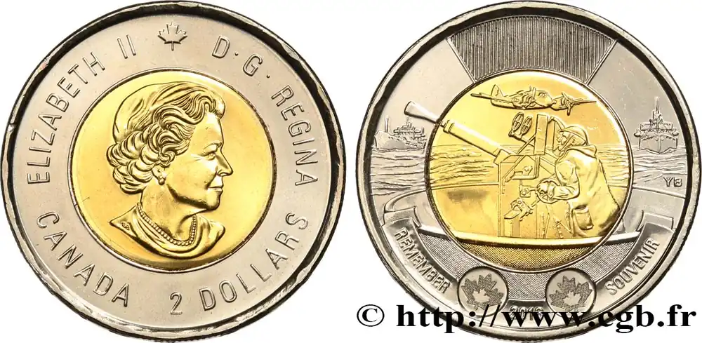 Type : 2 Dollars Bataille de l’AtlantiqueDate : 2016Quantité frappée : 5000000Métal : bimétalliqueDiamètre : 28 mmAxe des coins : 12 h.Poids : 6,99 g.Tranche : séries de cannelures avec inscription incuse CANADA 2 DOLLARSRéférence ouvrage :KM21/2103 AversTitulature avers : ELIZABETH II (FEUILLE) D.G.REGINA // CANADA 2 DOLLARS.Description avers : buste à droite de la reine Élisabeth II.ReversTitulature revers : YB // REMEMBER 2016 SOUVENIR.Description revers : au centre canon antiaérien et son servant survolés par un avion, navires marchands à gauche et à droite.CommentaireCette monnaie de 2 Dollars commémore la Bataille de l’Atlantique qui opposent entre 1939 et 1945 les flottes militaires et marchandes alliées à l’aviation et aux sous-marins allemands.HistoriqueCANADAC’est le 15 février 1965, sur la colline du Parlement à Ottawa, que se déroule la cérémonie d’inauguration du drapeau canadien, en présence du gouverneur général Georges Vanier, du premier ministre Lester B. Pearson et des membres du Cabinet, ainsi que de milliers de citoyens. On descend d’abord le Red Ensign, portant l’Union Jack et l’écu des armoiries royales du Canada. Puis, sur le coup de midi, on hisse l’unifolié. La foule entonne ensuite l’hymne national O Canada suivi de l’hymne royal God save the Queen. Les paroles prononcées ce jour-là par Maurice Bourget, président du Sénat, donnent un sens encore plus symbolique à ce drapeau : « Le drapeau est le symbole de l’unité de la nation, car il représente sans l’ombre d’un doute tous les citoyens du Canada, sans distinction de race, de langue, de croyance ou d’opinion ».Deuxième pays du monde par sa superficie, le Canada occupe la majeure partie de l’Amérique du Nord. Il s’étend d’est en ouest de l’océan Atlantique à l’océan Pacifique et vers le nord jusqu’à l’océan Arctique et il partage deux frontières avec les États-Unis au sud et au nord-ouest (Alaska). D’abord occupé par les peuples autochtones, le pays est né de l’union de trois colonies britanniques, lesquelles étaient des colonies françaises au temps de la Nouvelle-France. Aujourd’hui c’est un État fédéral de dix provinces et trois territoires. Le Canada a obtenu son indépendance du Royaume-Uni pacifiquement dans un processus qui s’est étalé de 1867 à 1982.