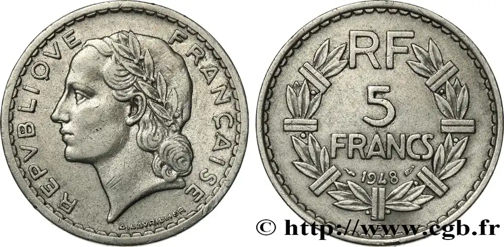 Type : 5 francs Lavrillier, aluminiumDate : 1949Quantité frappée : 203.251.600Métal : aluminiumDiamètre : 31 mmAxe des coins : 6 h.Poids : 3,81 g.Tranche : lisseRéférence ouvrage :Classement FRANC 2023 / FRANC 2023 classificationF.339/17AversTitulature avers : REPVBLIQVE FRANÇAISE.Description avers : tête laurée de la République aux cheveux longs à gauche ; au-dessous signé A. LAVRILLIER le long du listel.ReversTitulature revers : RF / 5 / FRANCS / (MILLÉSIME).Description revers : en quatre lignes dans le champ au-dessus du millésime encadré des différents, le tout dans une couronne de laurier ornée de sept bagues.CommentaireExemplaire avec le 9 fermé.HistoriqueQUATRIÈME RÉPUBLIQUE(16/01/1947-8/01/1959) Se caractérisant par un régime parlementaire doublé d’une grande instabilité ministérielle, la Quatrième République a pour particularité de n’avoir jamais été officiellement proclamée. En effet, De Gaulle, lors de son arrivée à Paris le 25 août 1944, refuse de le faire sous prétexte que la République n’avait jamais cessé d’exister. Considérant que l’État français du maréchal Pétain n’était qu’un simple état de fait, il estime que la République a survécu dans la France libre et son acte de naissance doit alors être le 18 juin 1940. Toutefois, son départ, le 20 janvier 1946, et le référendum du 13 octobre 1946 approuvant une nouvelle Constitution, marquent le début officiel de cette république. Elle connaît deux présidents : Vincent Auriol (16/01/1947 – 23/12/1953) et René Coty (23/12/1953 – 8/1/1959). La crise ouverte causée par la révolte de l’armée d’Algérie entraîne, en 1958, sa chute qui est confirmée par l’adoption d’une nouvelle constitution le 28 septembre 1958. Néanmoins, elle ne cesse définitivement d’être que le 8 janvier 1959 lors de l’installation du général de Gaulle comme président de la Ve République.