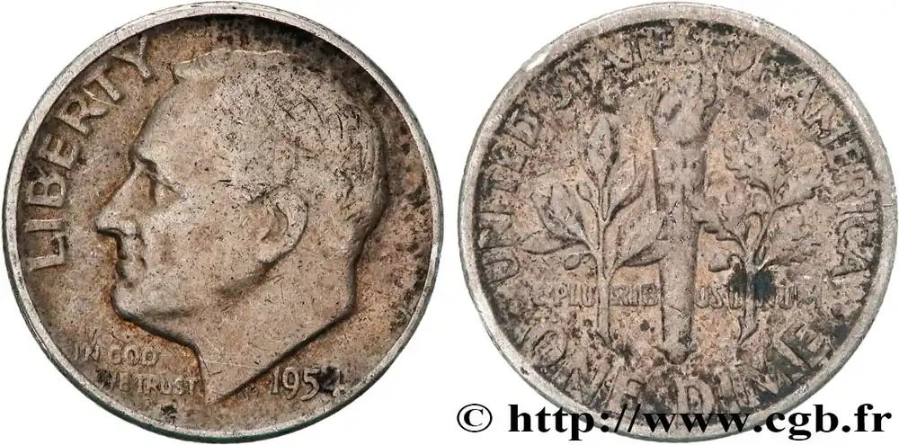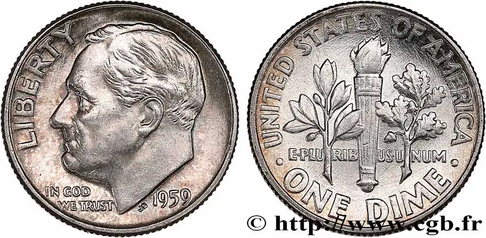 Type : 1 Dime (10 Cents) RooseveltDate : 1948Nom de l’atelier/ville : PhiladelphieQuantité frappée : 75000000Métal : argentTitre en millième : 900 ‰Diamètre : 17,9 mmAxe des coins : 6 h.Poids : 2,48 g.Tranche : striéeRéférence ouvrage :KM20/195 – Y.- AversTitulature avers : LIBERTY .Description avers : portrait à gauche du président Franklin Delano Roosevelt ; IN GOD WE TRUST dans le champ.ReversTitulature revers : UNITED STATES OF AMERICA / .ONE DIME..Description revers : torche entre un rameau de laurier et un rameau de chêne ; E.PLURIBUS.UNUM dans le champ.HistoriqueÉTATS-UNIS D’AMÉRIQUE