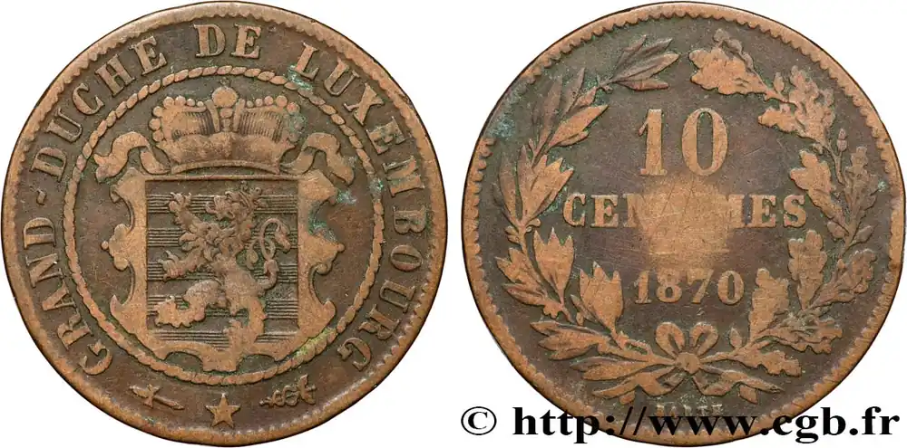 Type : 10 CentimesDate : 1854Nom de l’atelier/ville : UtrechtQuantité frappée : 500000Métal : bronzeDiamètre : 31 mmAxe des coins : 6 h.Poids : 9,70 g.Tranche : lisseRéférence ouvrage :KM.19/23.1 AversTitulature avers : GRAND-DUCHÉ DE LUXEMBOURG.Description avers : écu au lion couronné.ReversTitulature revers : 10 / CENTIMES / 1854 / BARTH.Description revers : dans le champ, couronne d’olivier et de rameau de chêne.HistoriqueLUXEMBOURG